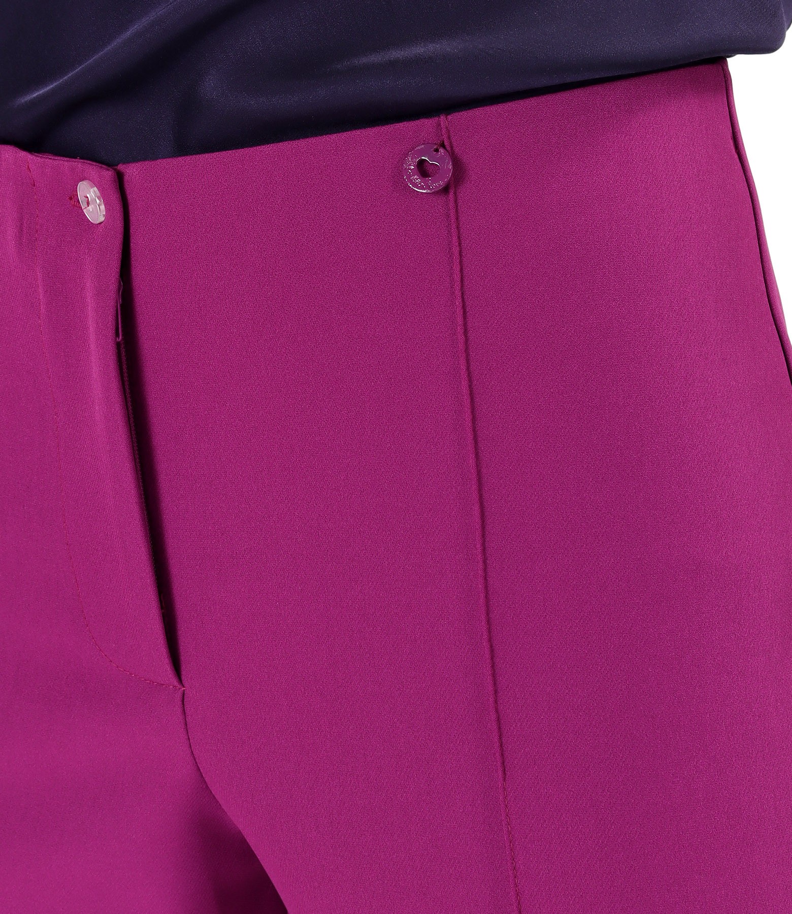 Pants made of elastic fabric, with a stripe sewn on the front, with a decorative and elastic element at the waist. Closes with a zipper and a button on the front.