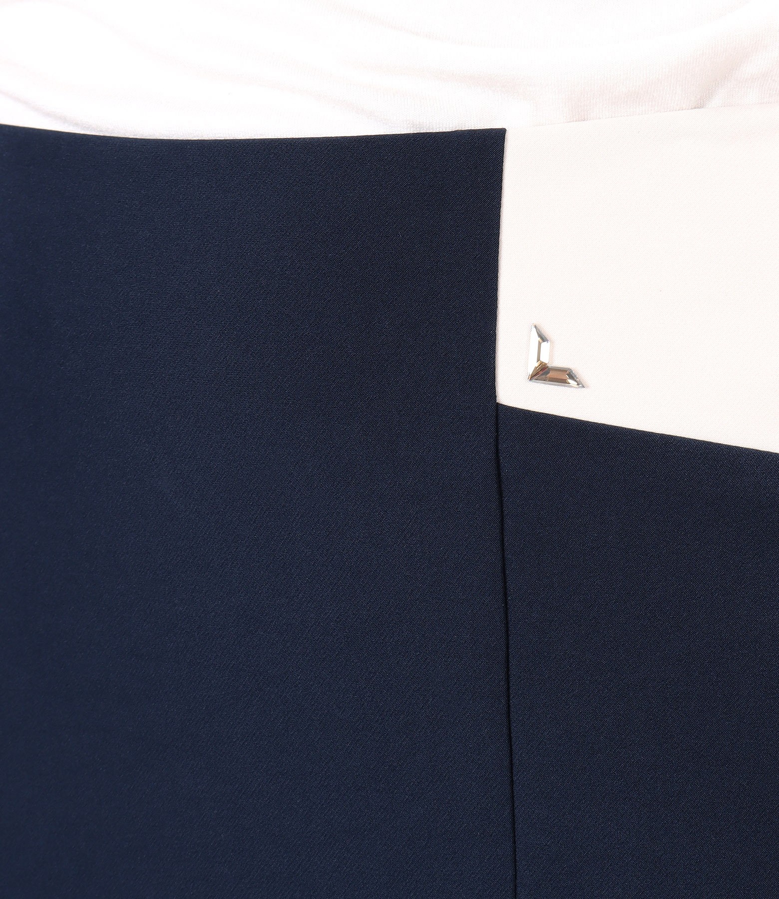 Elastic fabric skirt in two colors, padded, without waist cord, embellished with crystals at the waist. Closes with a hidden zipper on the middle back.