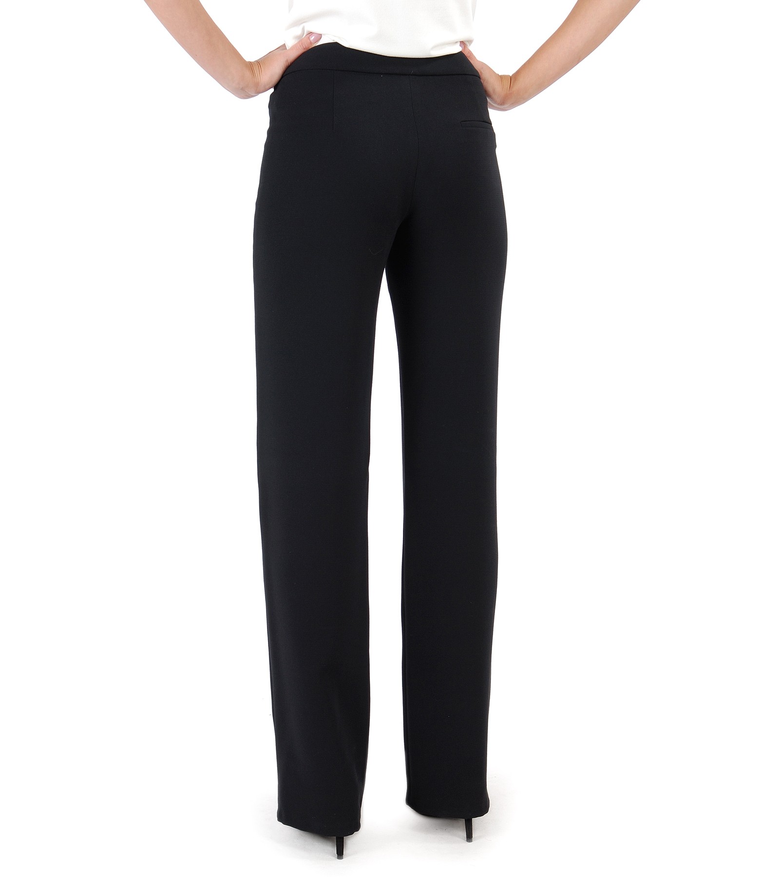 Office straight pants, made of elastic fabrucm with back pocket and wide waist belt. Closes with normal zipper , button and 2 front staples.