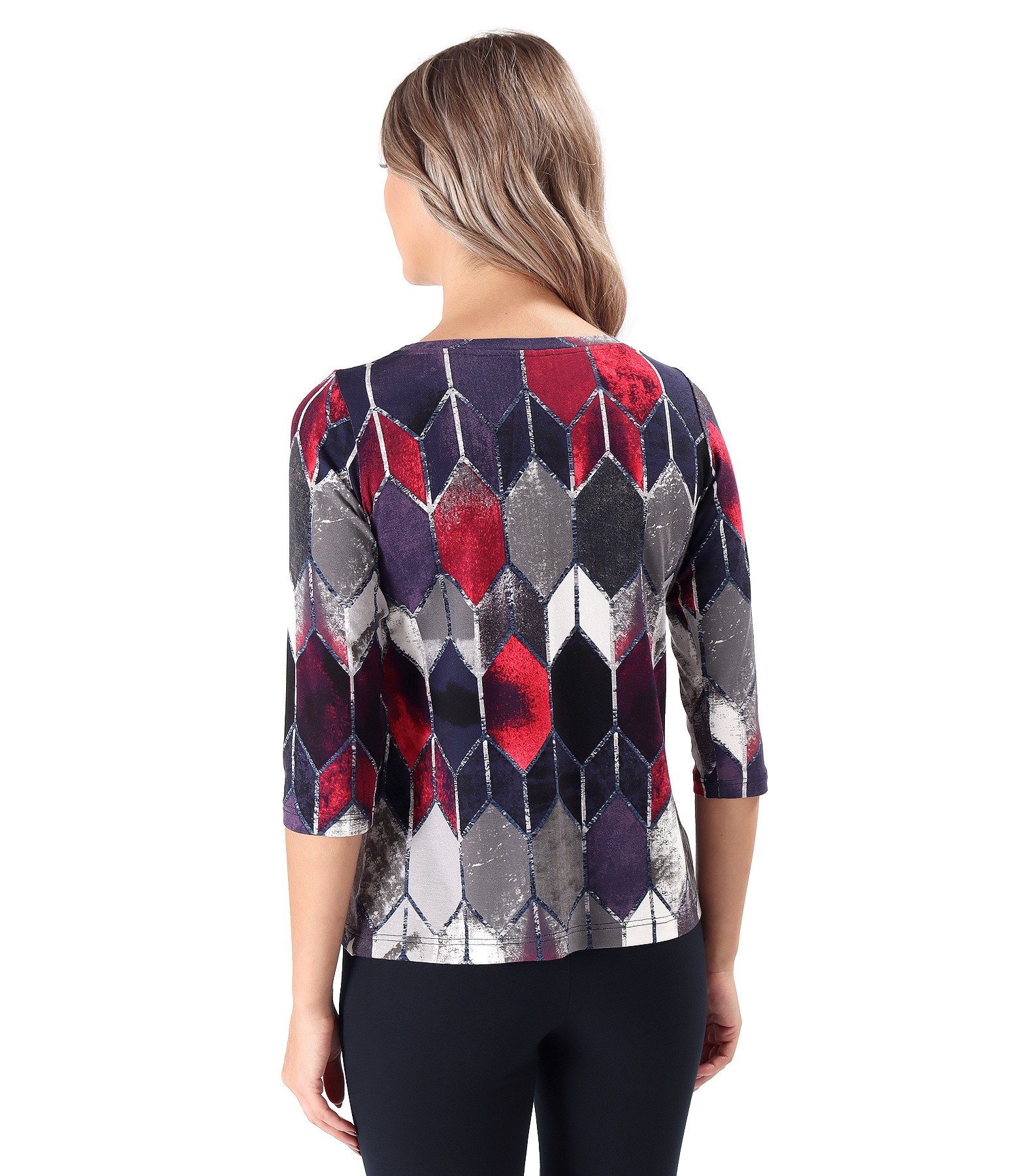 Elastic viscose jersey blouse, printed with geometric motifs, with a round neckline and 3/4 sleeves. The position of the print varies per product.