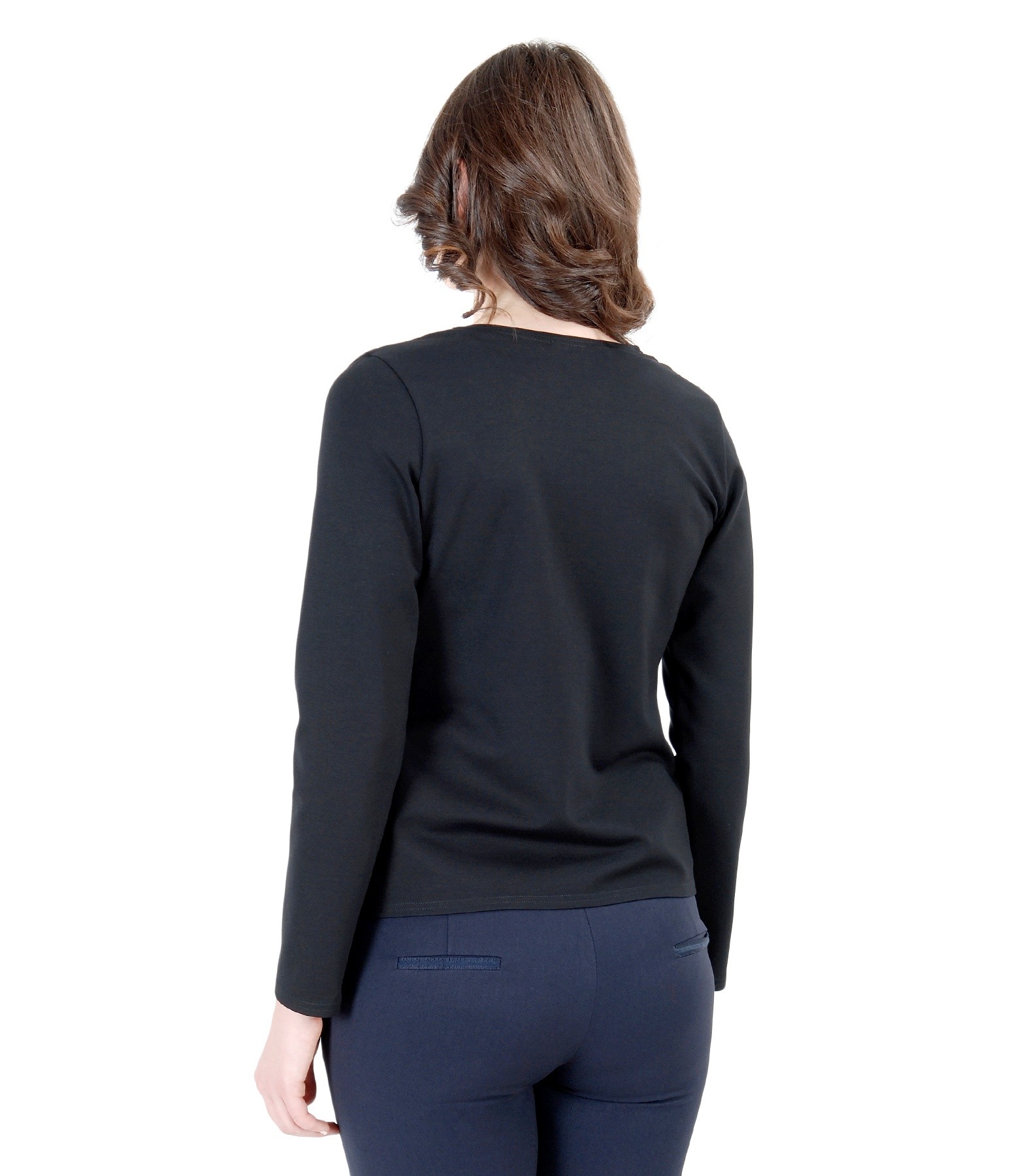Elastic jersey blouse, front opened and curled on waist. Tied with front belt.