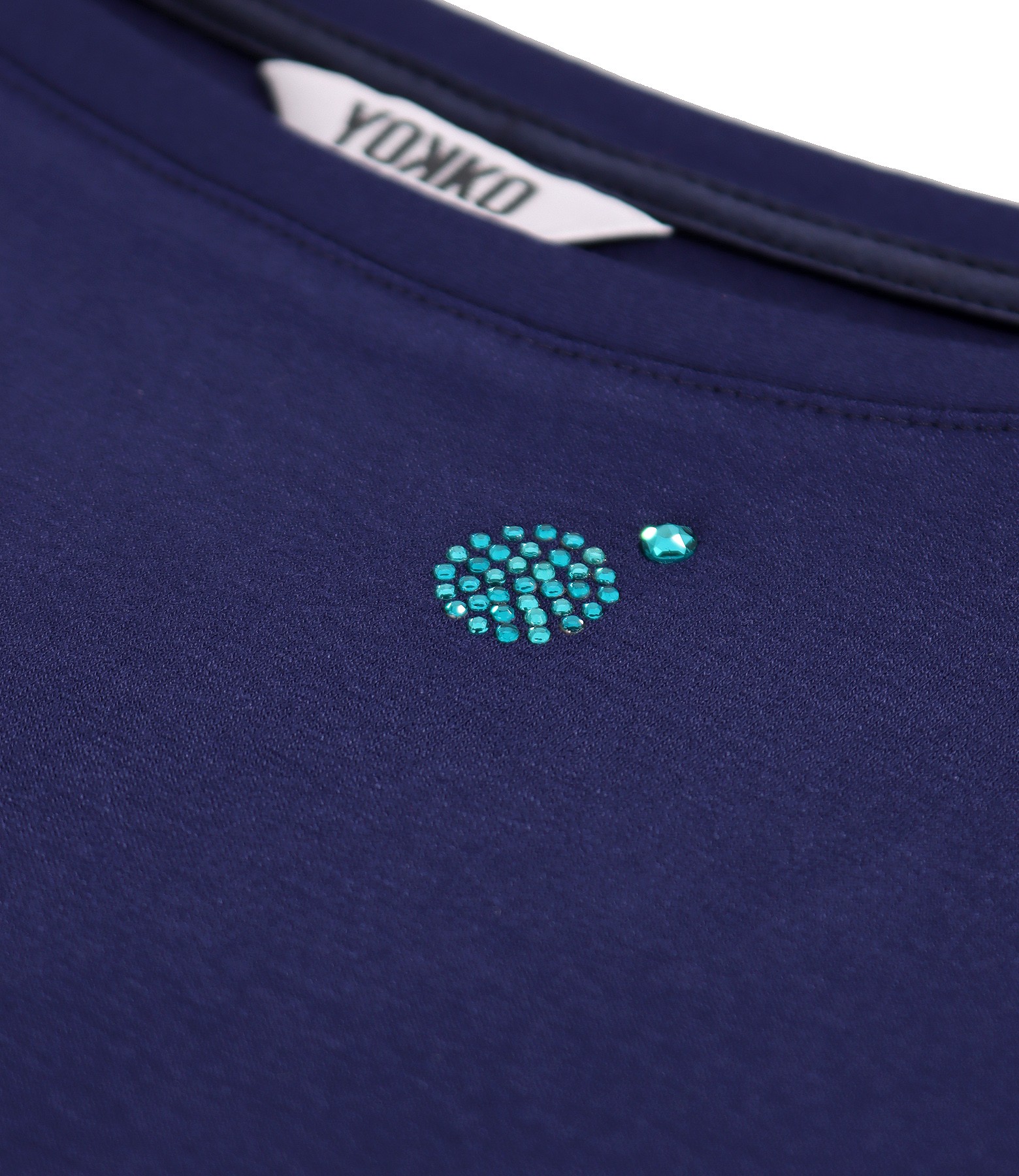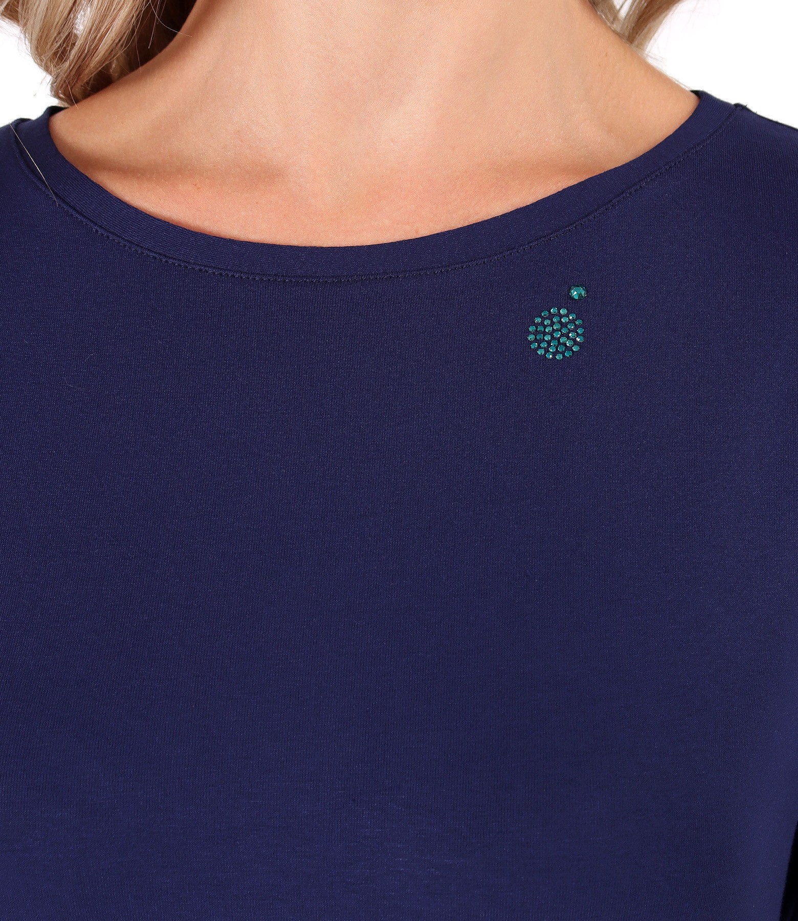 Elastic jersey blouse with 3/4 sleeves and round neckline with crystals.