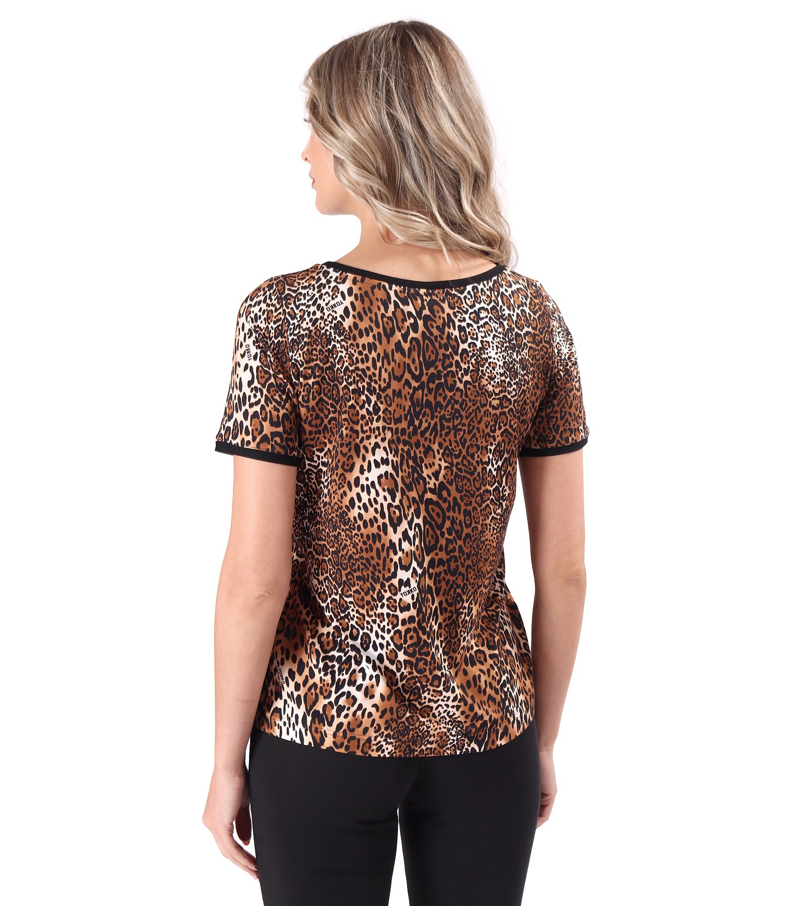 Elastic jersey blouse with animal print, with contrasting trims, short sleeves and a round neckline. The position of the print varies per product.
