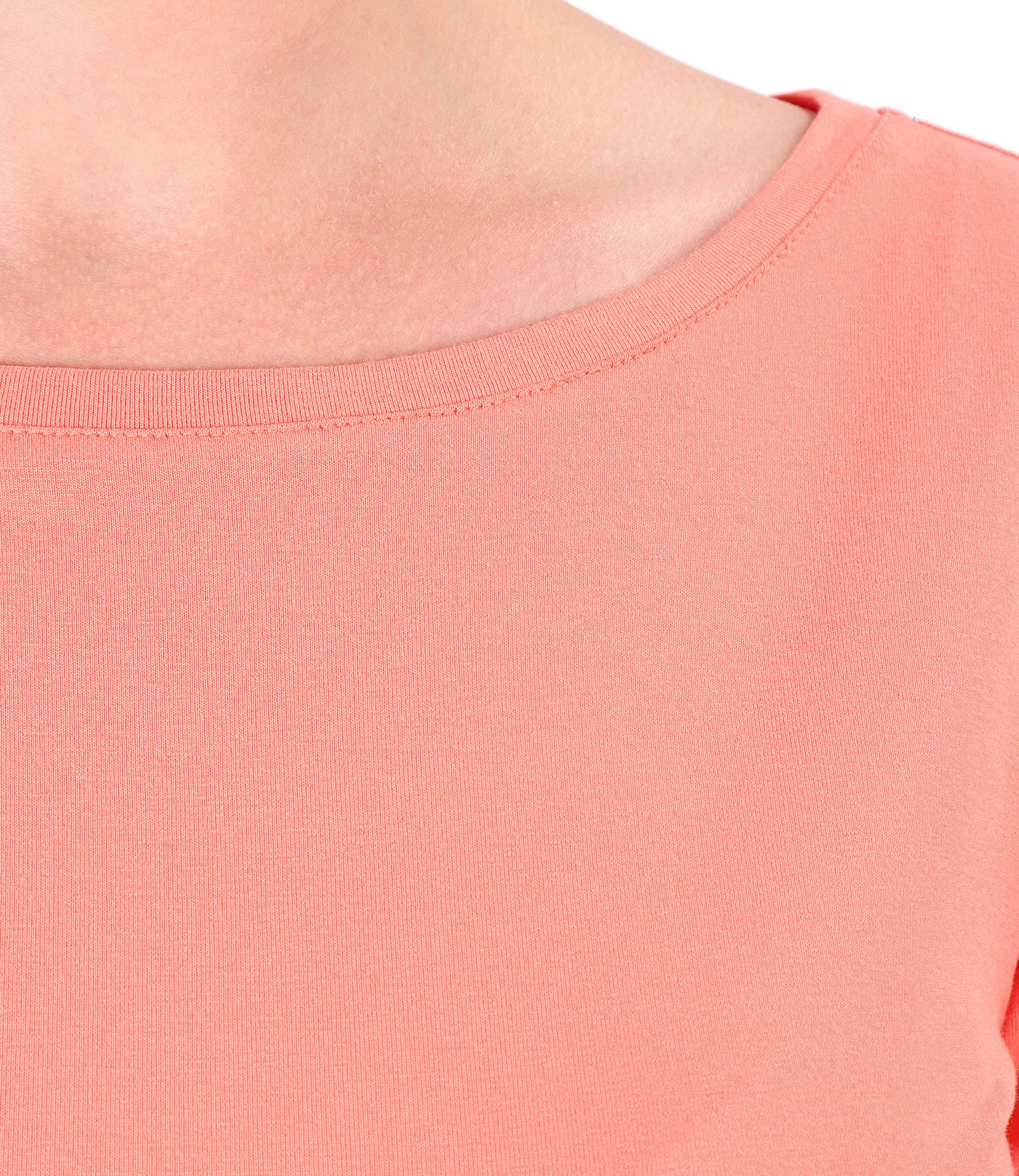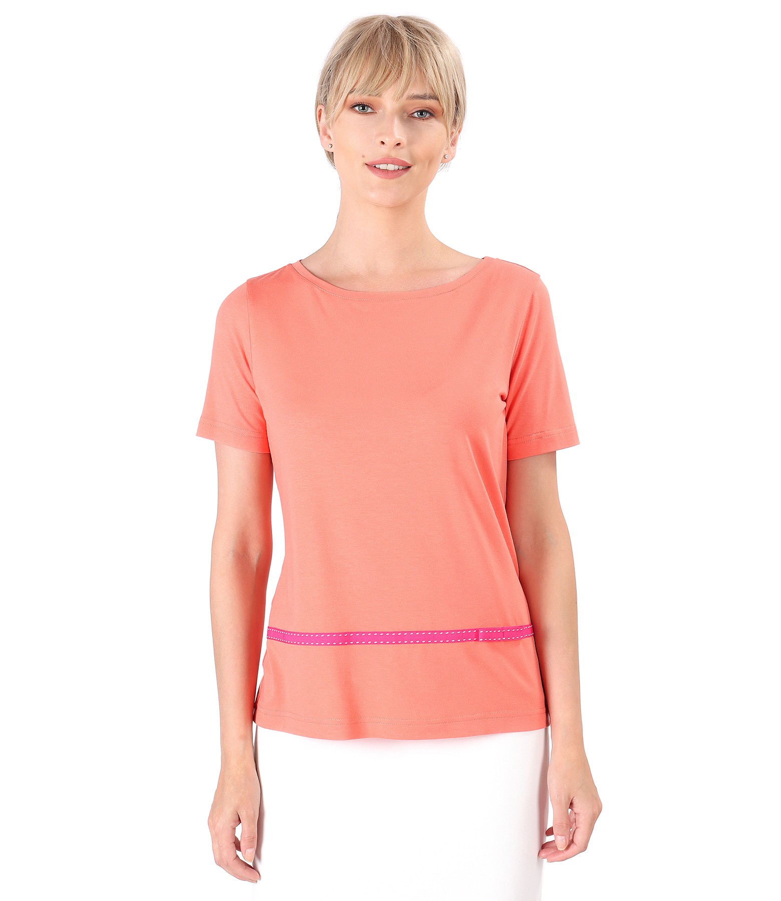 Blouse made of elastic jerseys, short sleeves, round neckline and ribbed band with bottom, applied to the face. Without closing system.