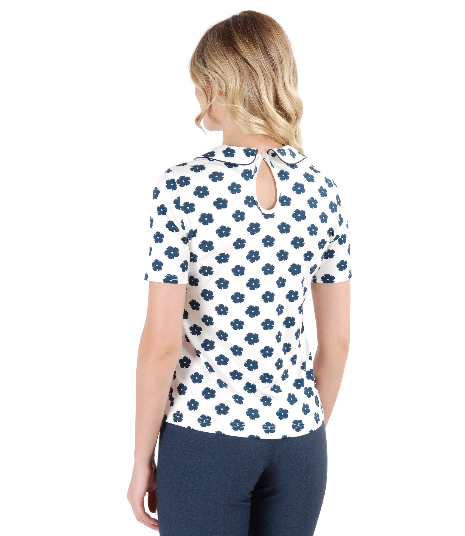 Elastic jersey blouse with floral print , with short sleeves and round collar. Closes with a back button.