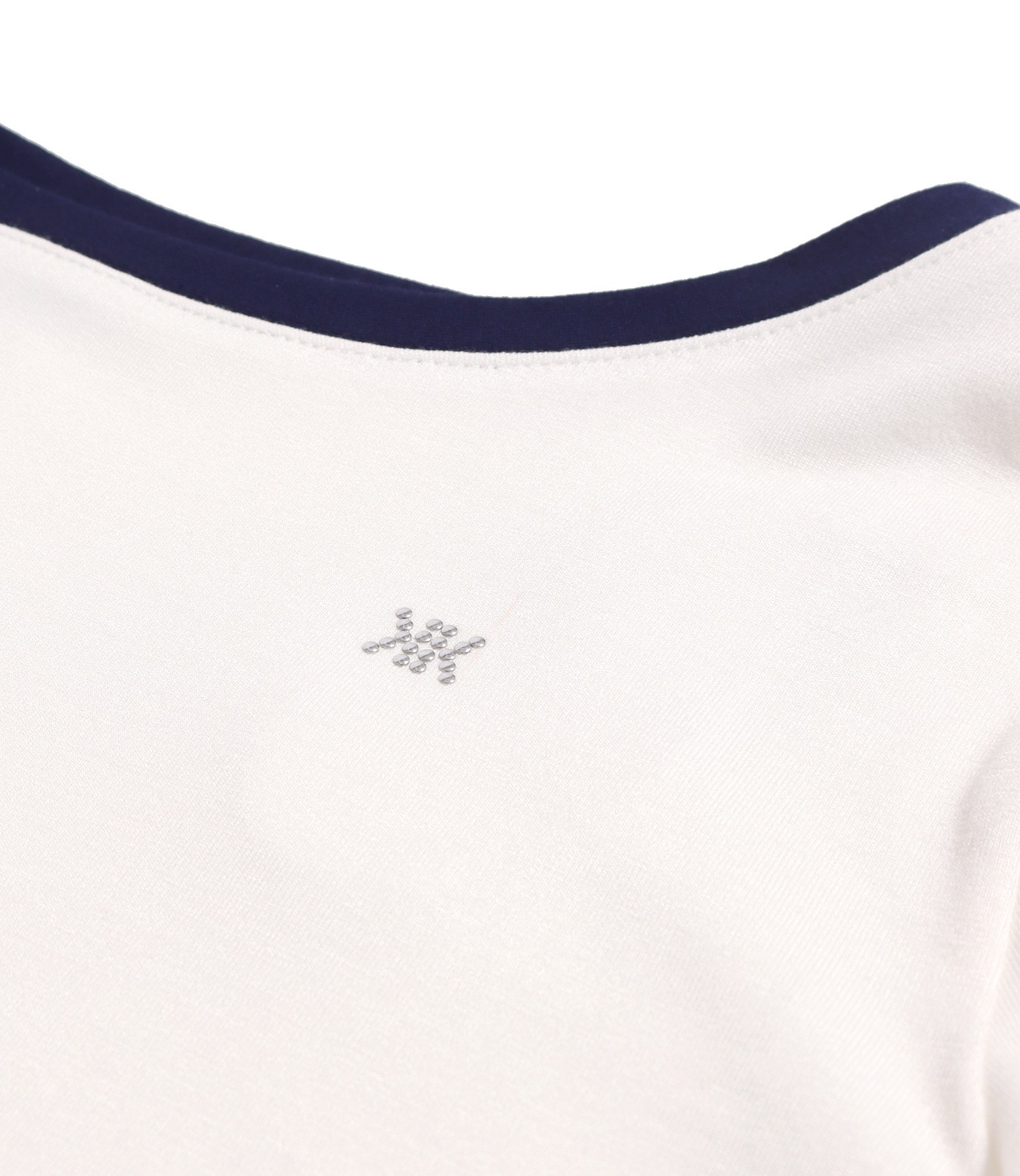 Elastic jersey blouse with contrasting trims, short sleeves, and round neckline.