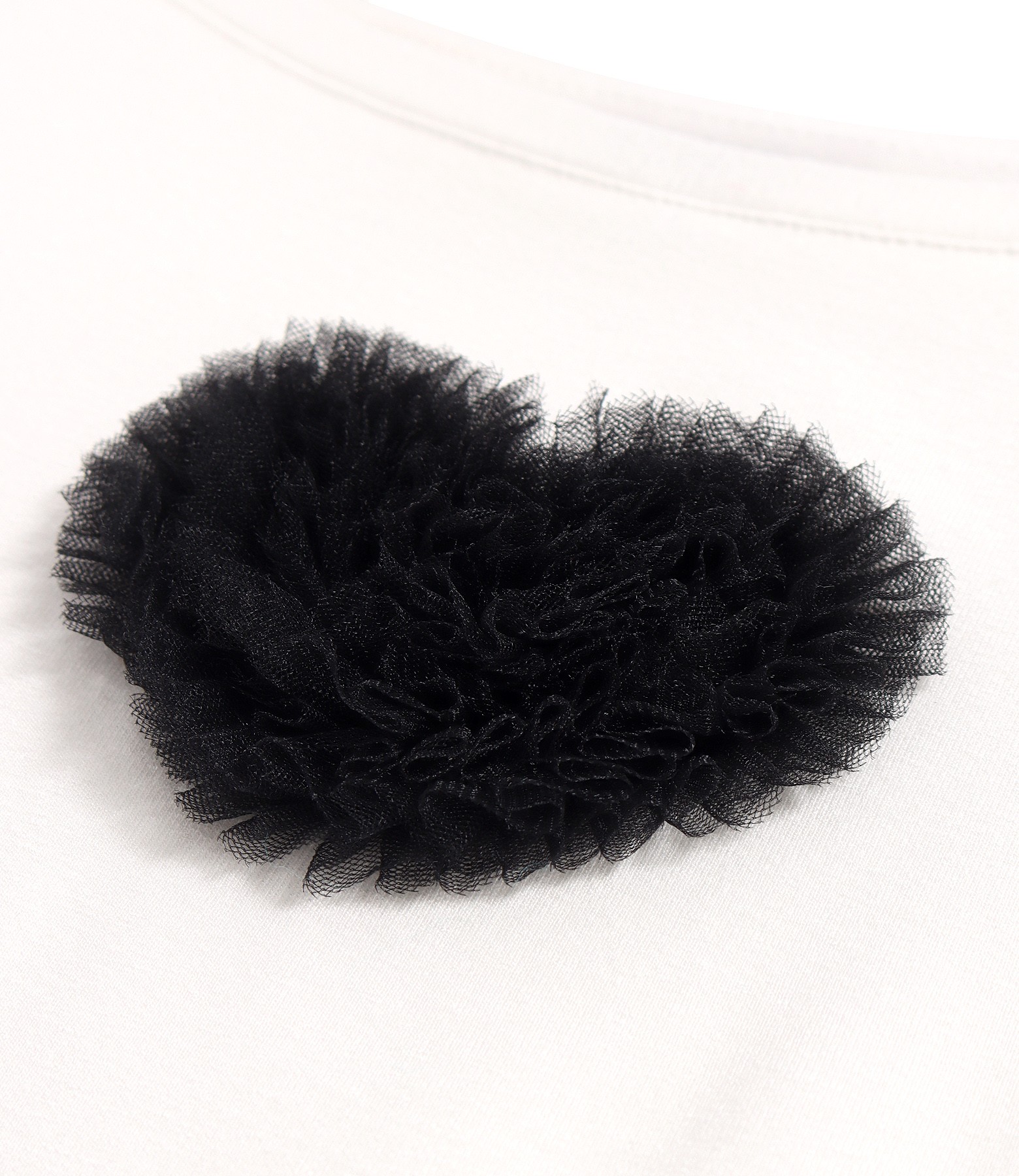 Elastic jersey blouse with decorative tulle heart, short sleeves, and round neckline.