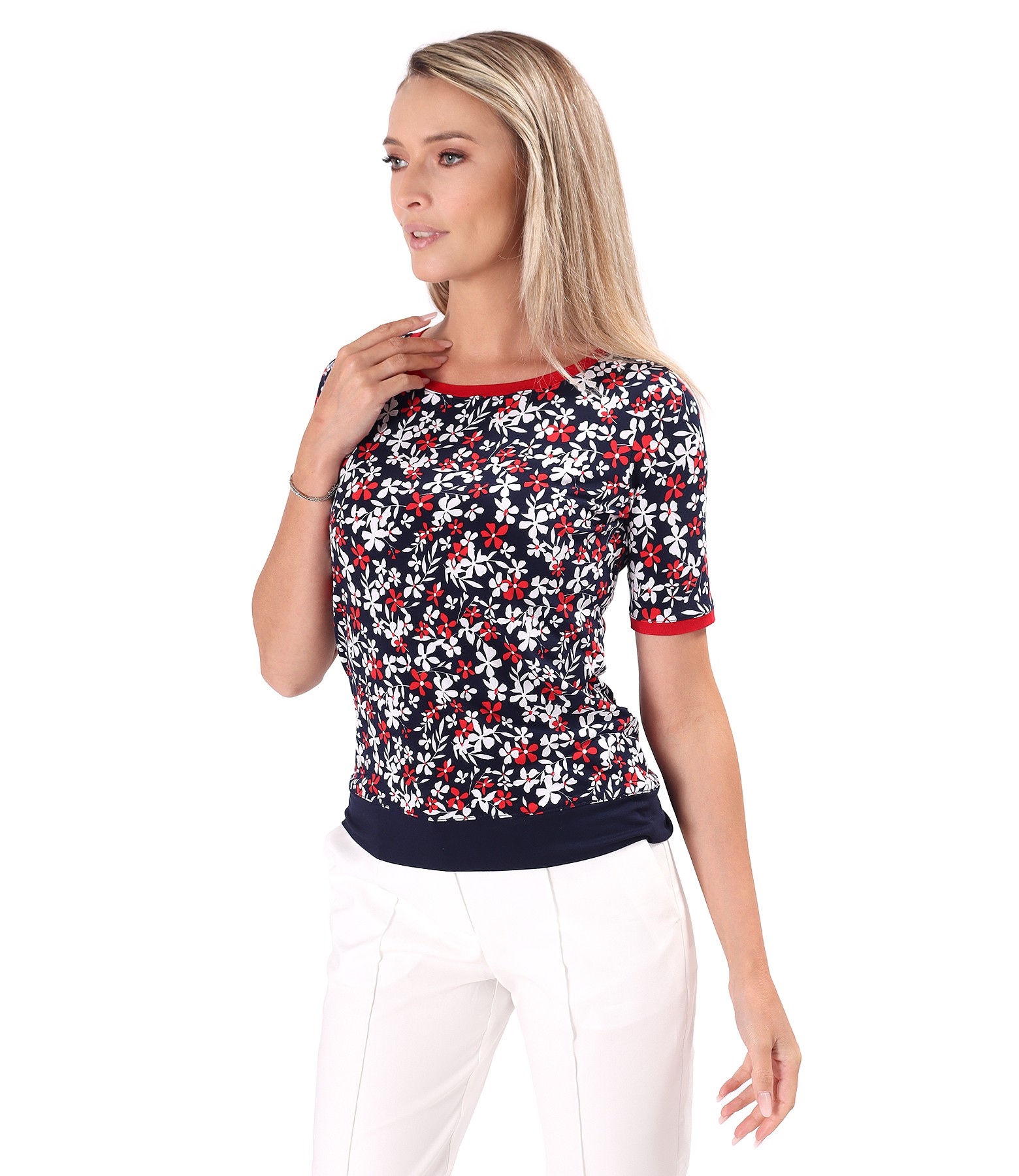 Elastic jersey blouse with embossed floral print, with short sleeves and trim.