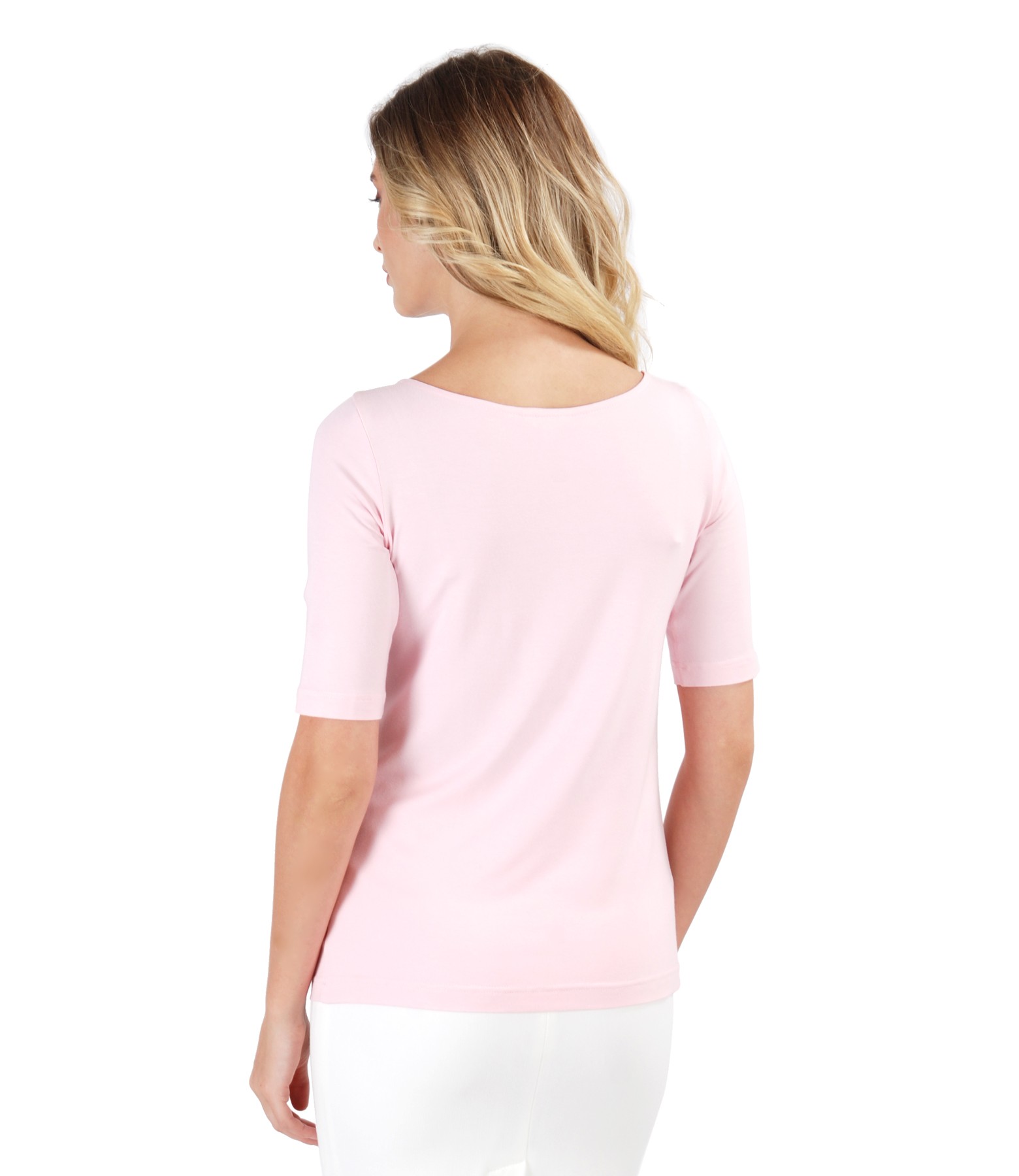 Uni jersey blouse, with short sleeves, round low-cut neck, embellished with crystals on the decolletage.