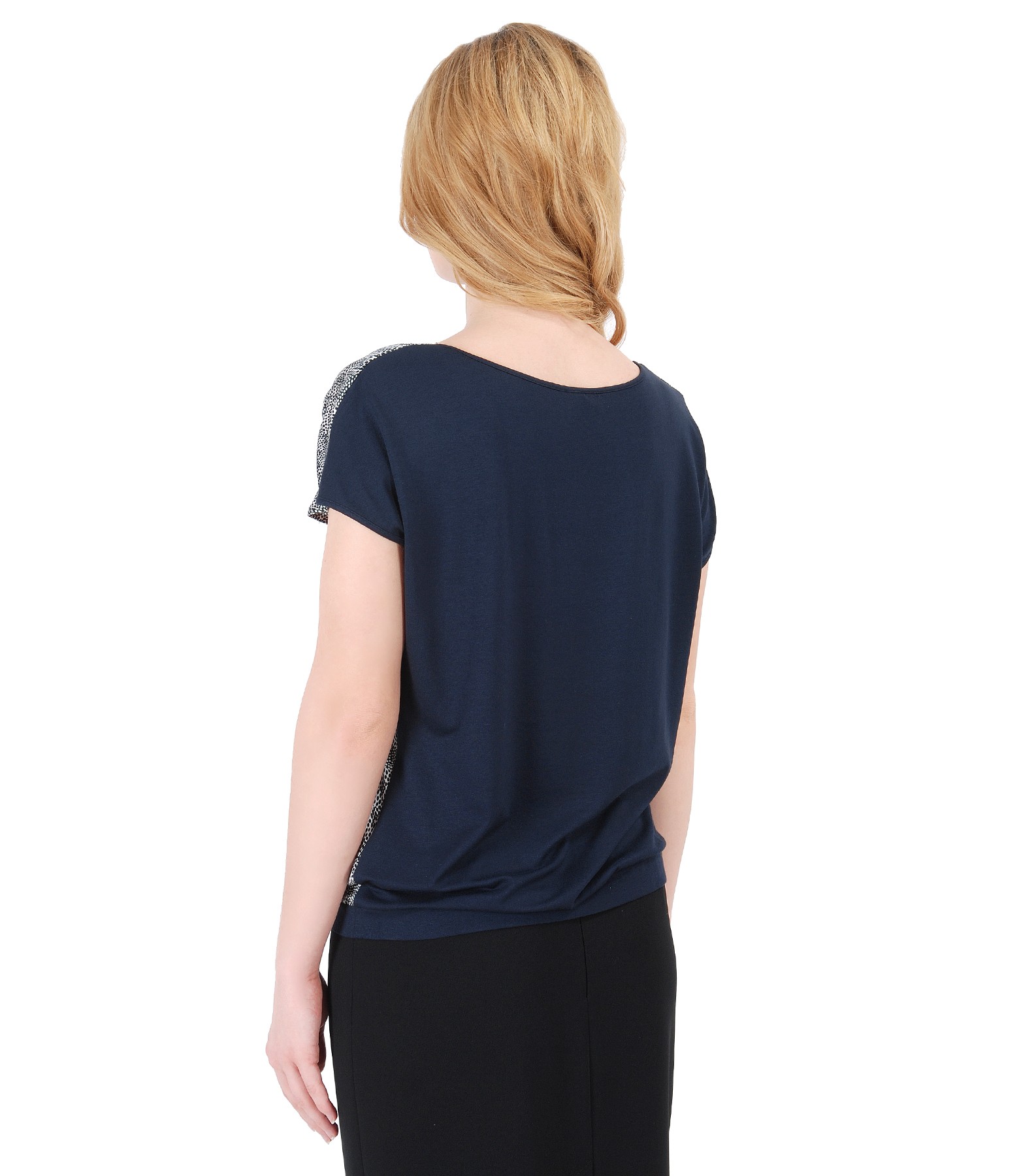 Elastic jersey blouse, with front made of printed viscose, with round decolletage and draping sleeves.