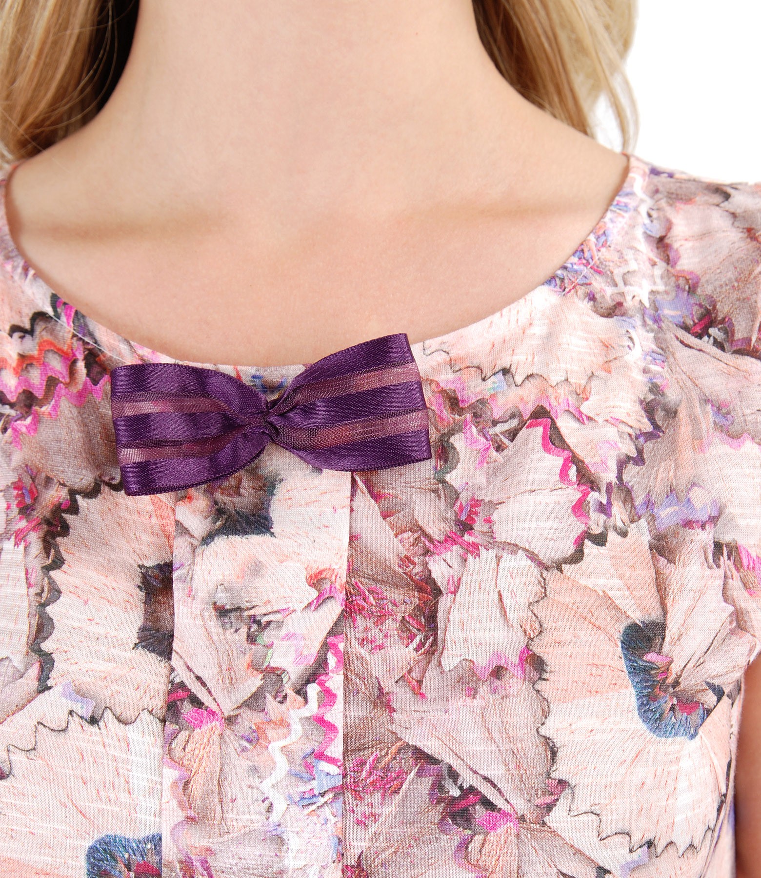 Elastic jersey blouse with geometric print, short sleeves, round low-cut neck and detachable bow on decolletage.