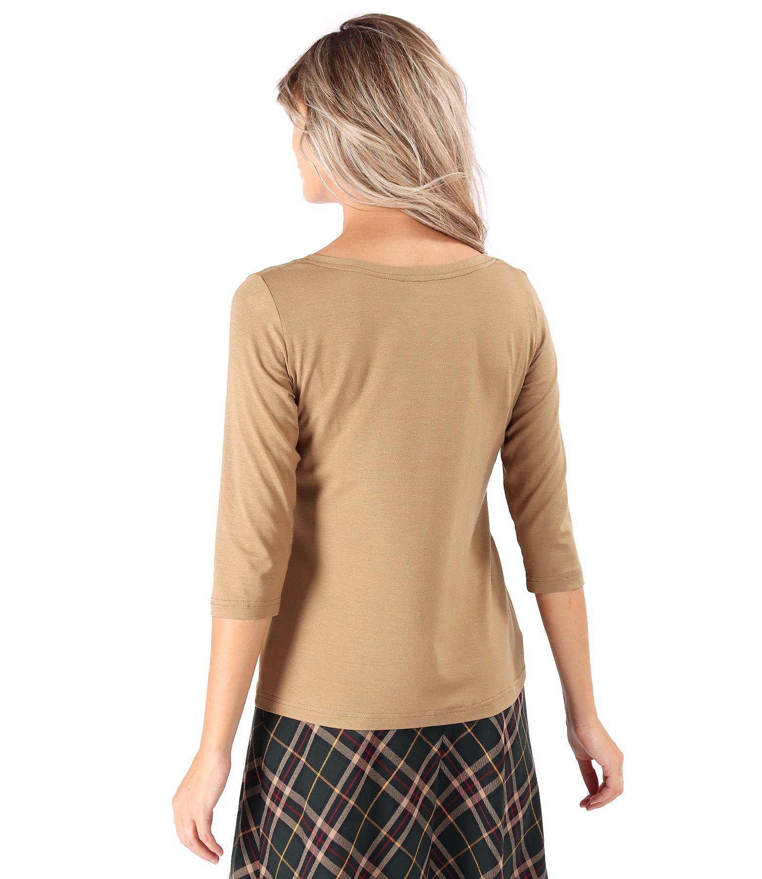 Elastic jersey blouse, with 3/4 sleeves, round neckline, and golden elastic at the waist.