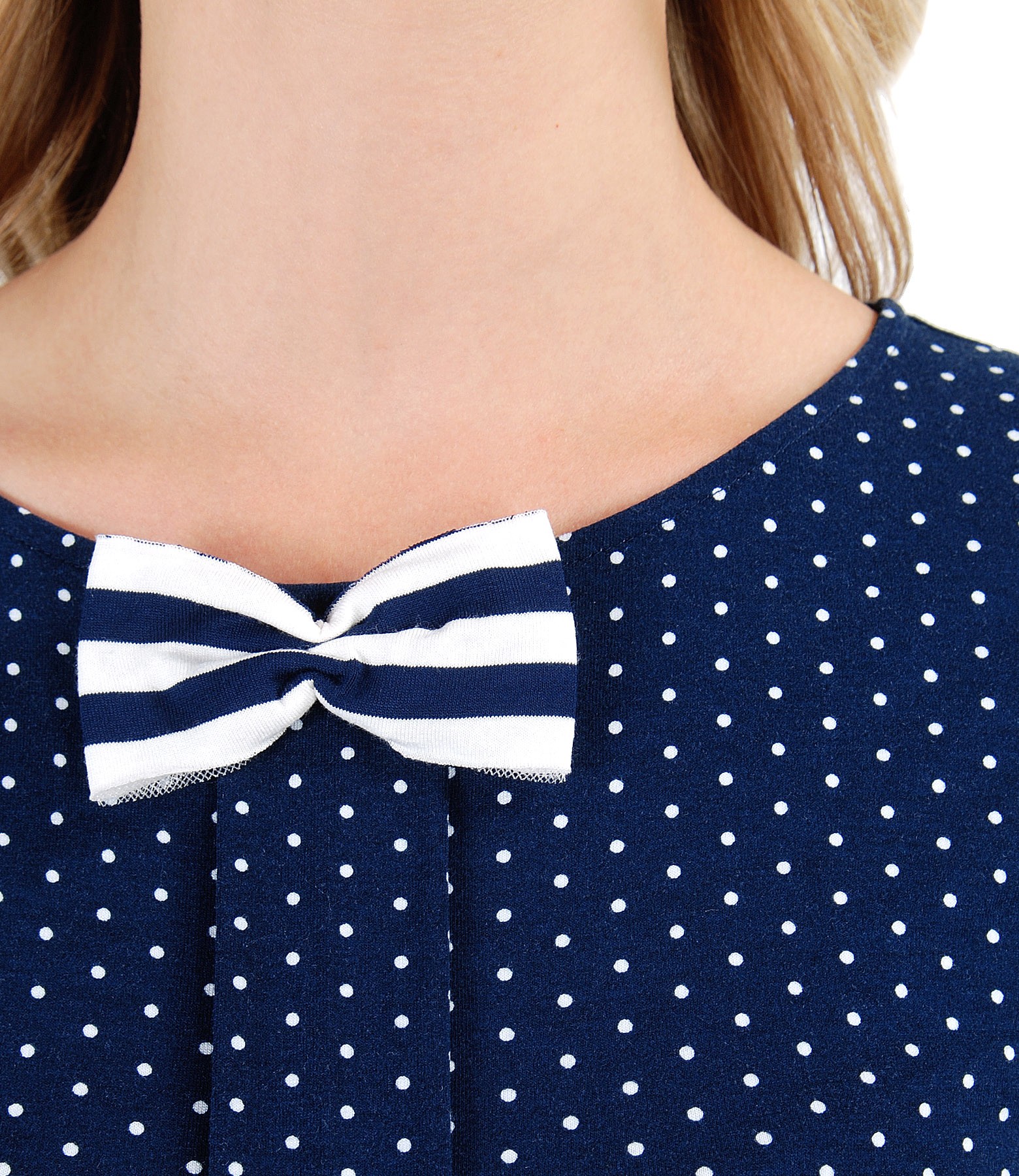Elastic jersey blouse with lace corner print, short sleeves, round low-cut neck and detachable bow on decolletage.