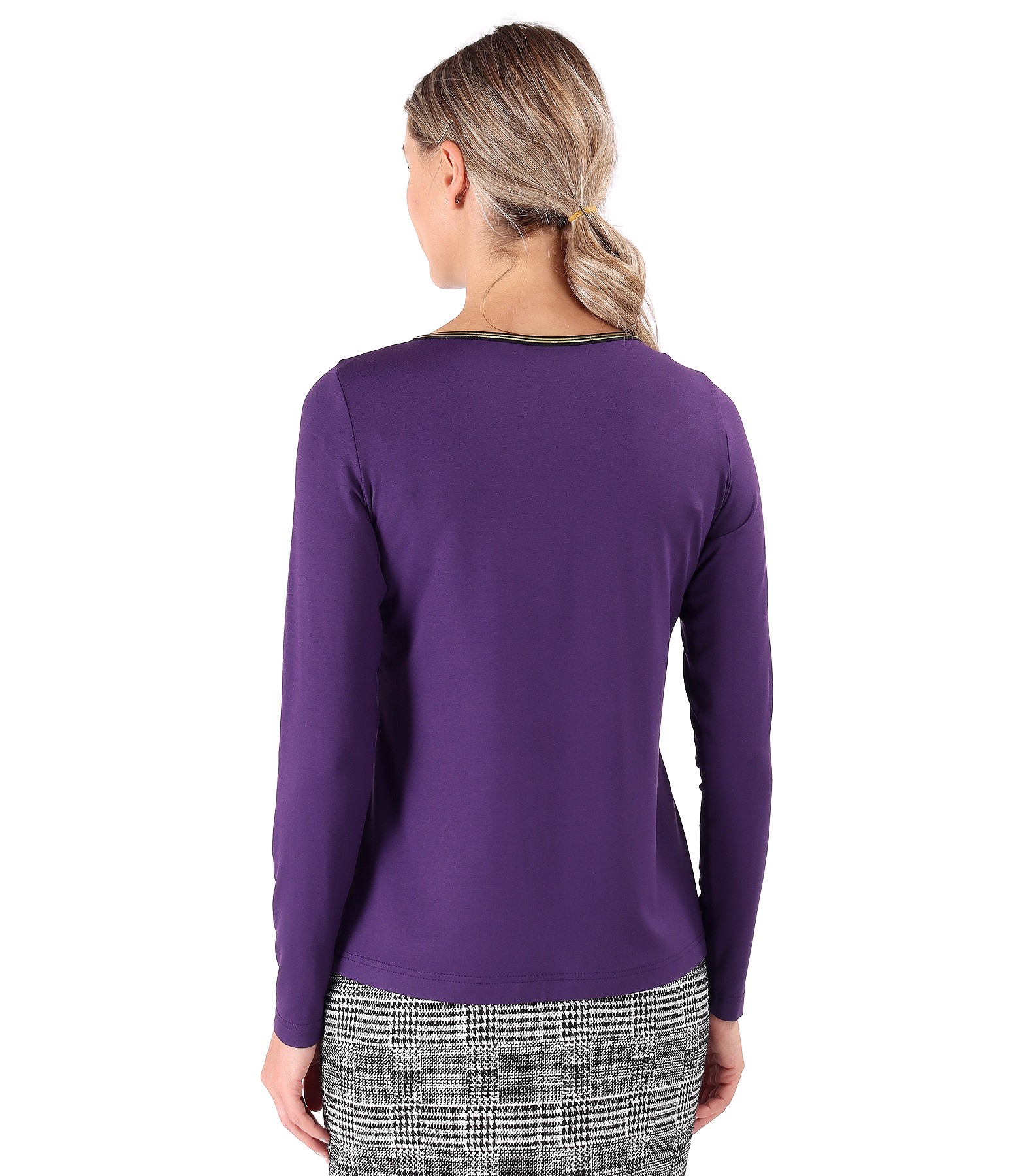 Elegant blouse made of elastic viscose jersey, with long sleeves and round neckline with golden elastic lining.