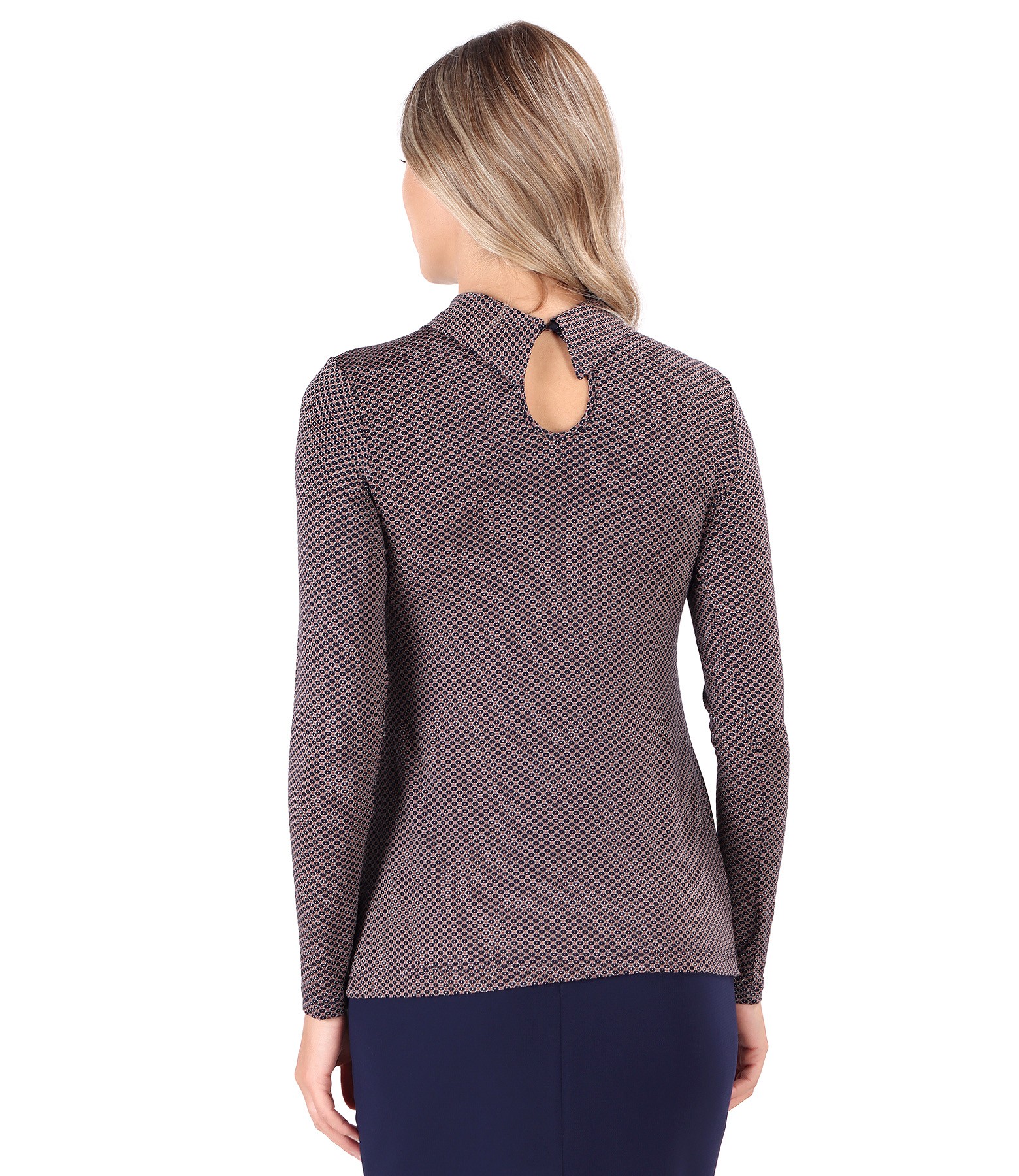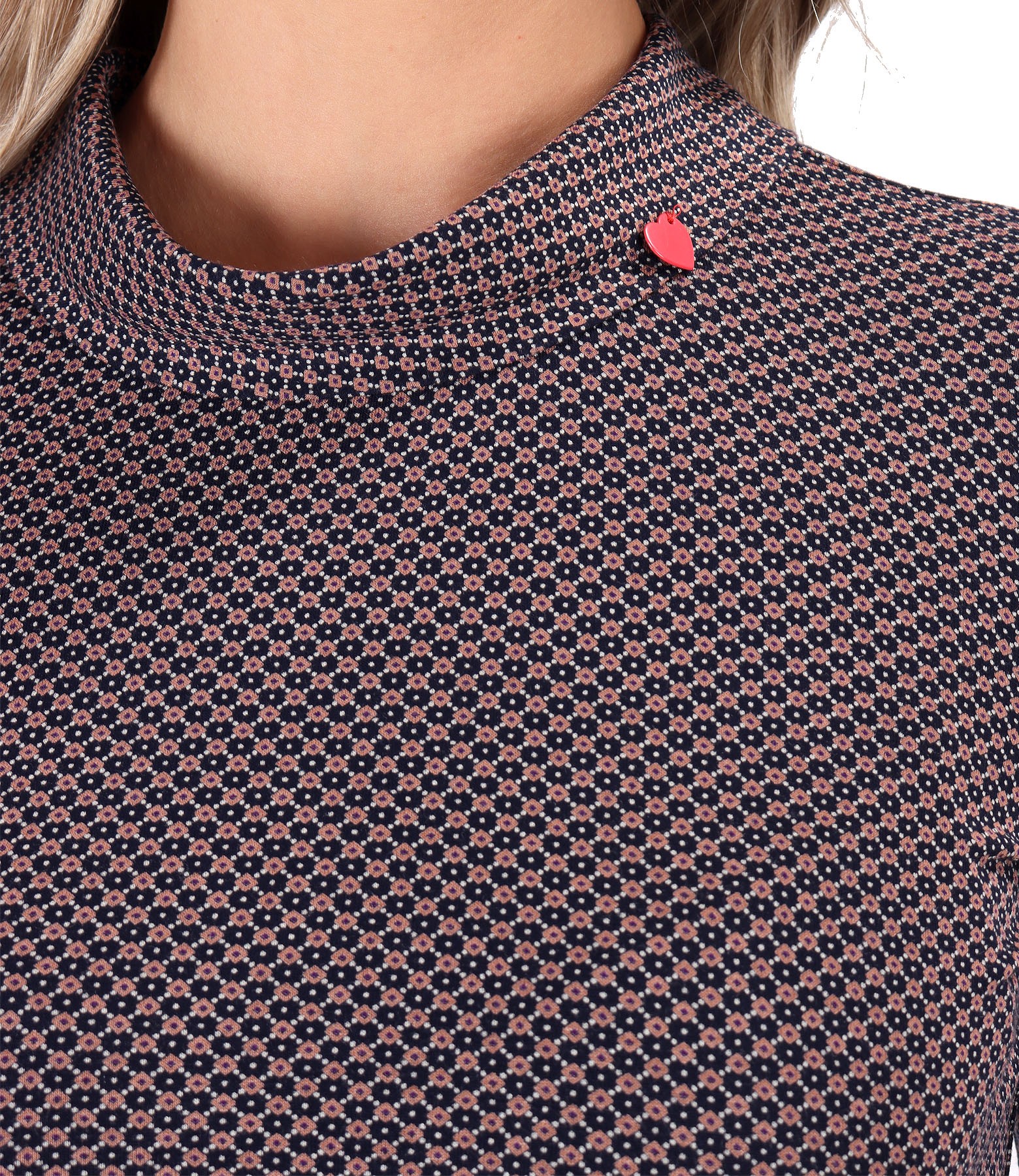 Elastic viscose jersey blouse, printed with geometric motifs, with long sleeves, round collar at the base of the neck and metallic heart sewn on the collar. Closes with a button on the middle back.