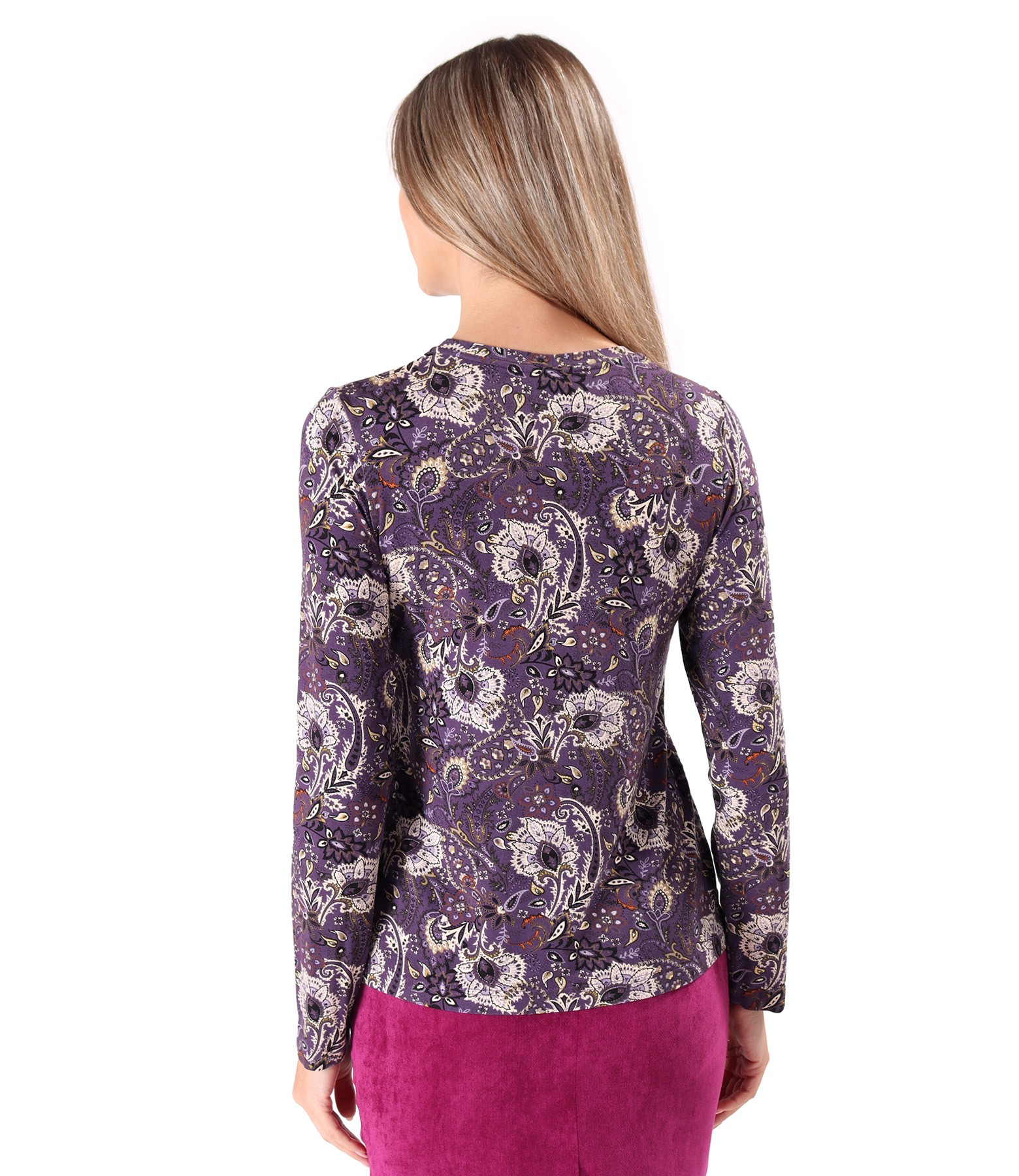 Blouse made of elastic viscose jersey printed with floral motifs, with long sleeves and round neckline. The position of the print varies per product.