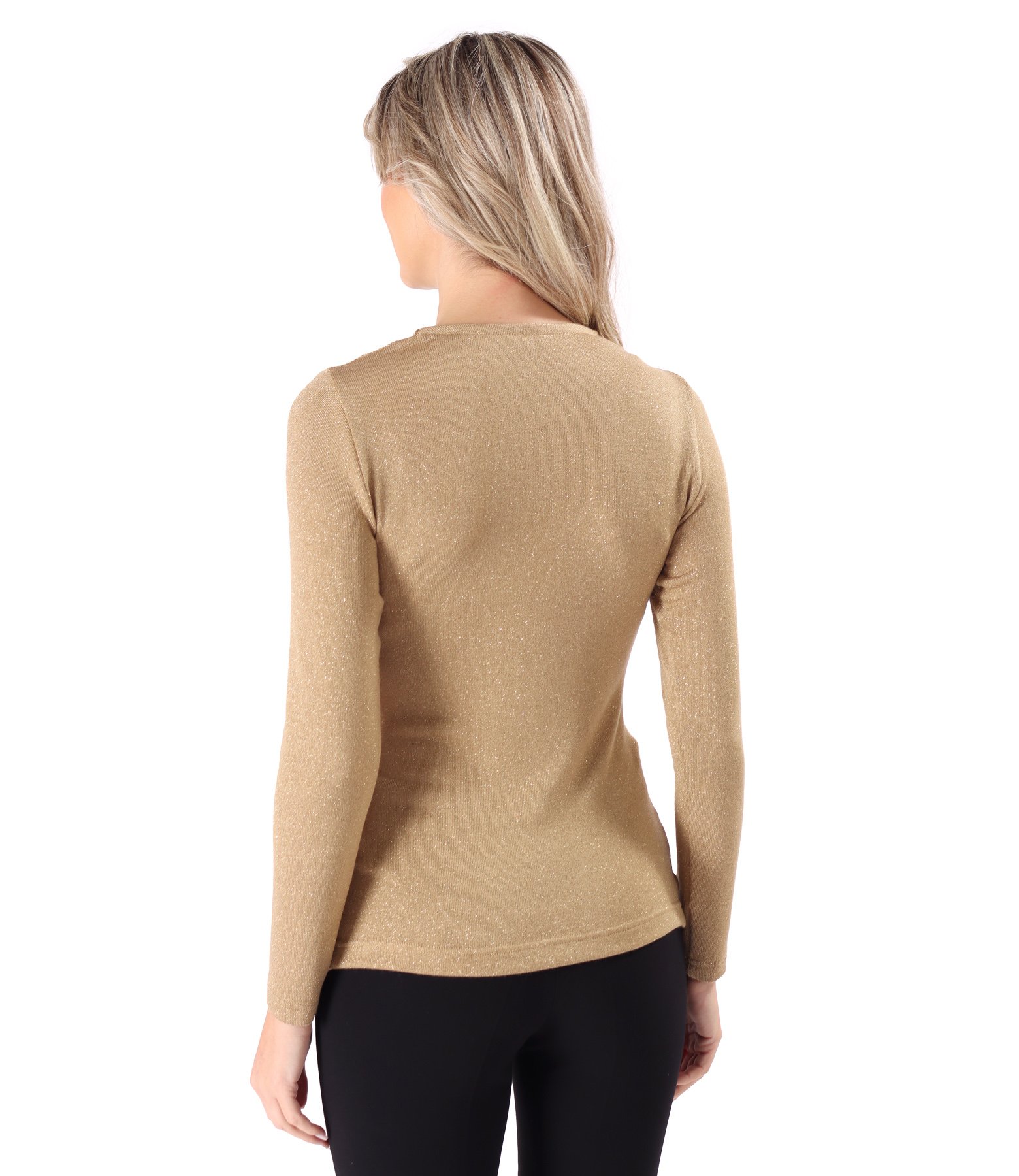 Elastic jersey blouse with metallic thread, fitted, with long sleeves and pleated neckline.