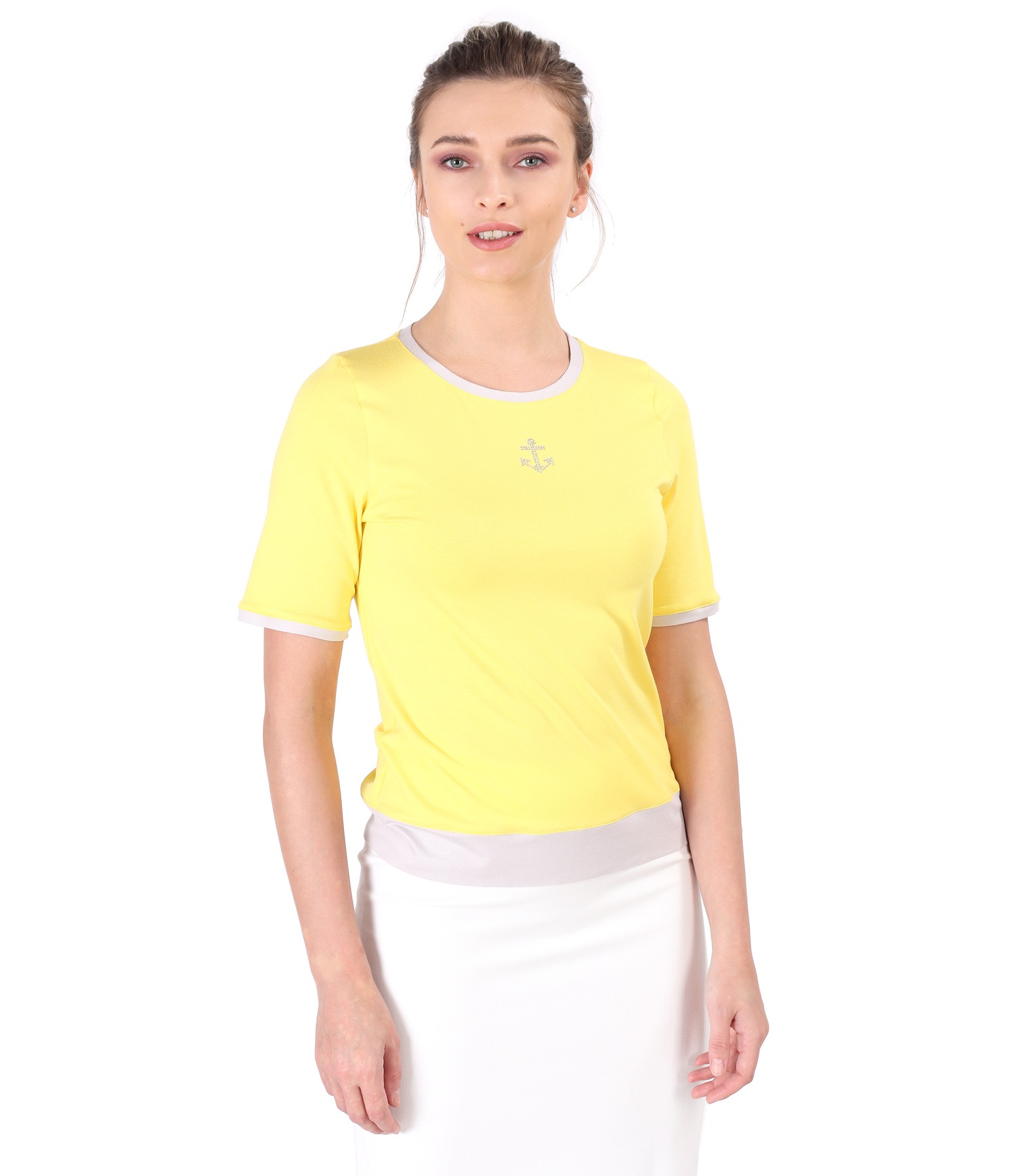 Uni elastic jersey blouse, with short sleeves, ornament glued to the face and trim at the neckline and sleeve finish.