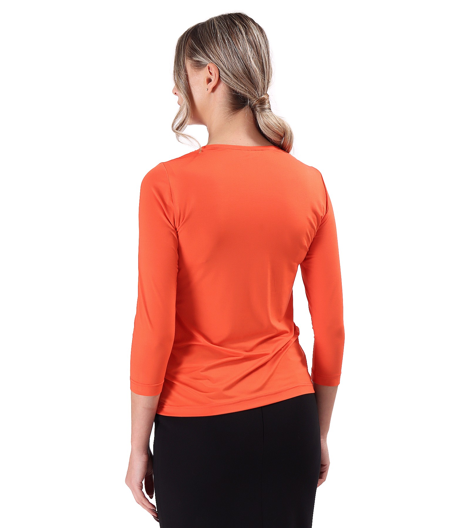 Elastic jersey blouse with pleated neckline and 3/4 sleeves (Coral red), size