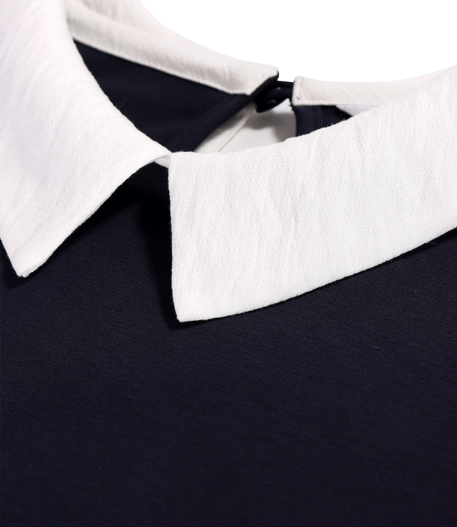 Elastic jersey blouse, with 3/4 sleeves and white pointed collar. Close with a button on the back.