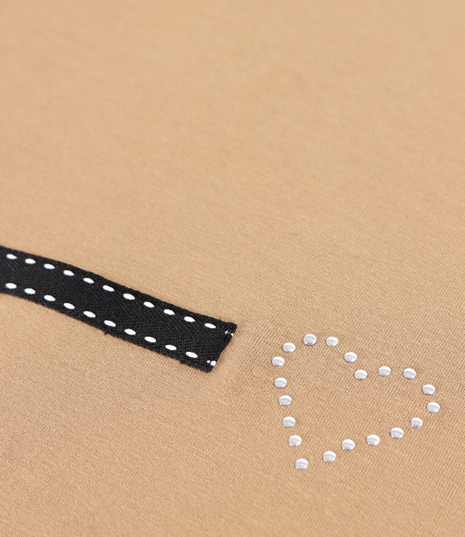 Elastic jersey blouse with rips band at the waist and decorative application in the shape of a heart, with short sleeves and round neckline.
