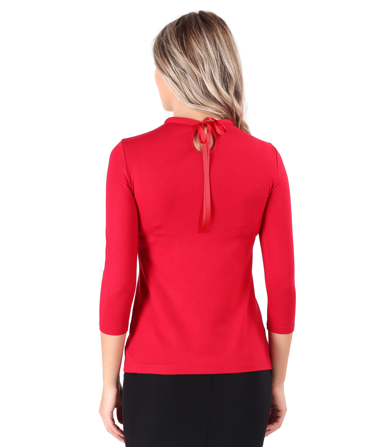 Elastic jersey blouse, with 3/4 sleeves, round collar at the base of the neck embellished with crystals. and folds on the face. Closes with rips band on the back.