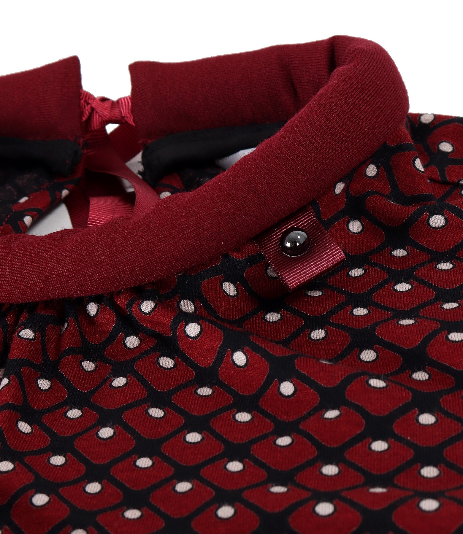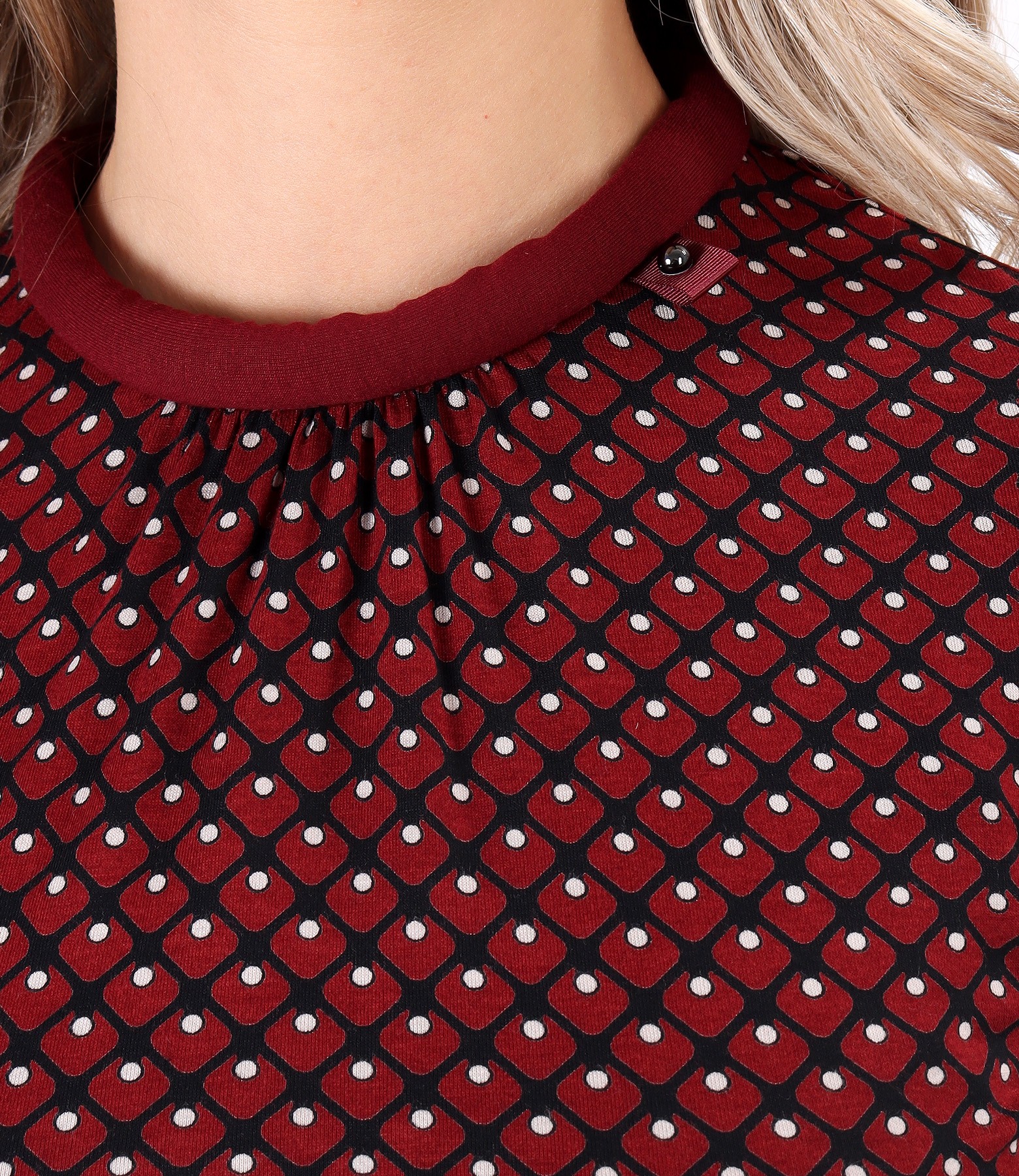 Blouse with front and back made of elastic jersey printed with geometric motifs, with long sleeves made of elastic jersey, round collar at the neck embellished with crystals. and folds on the face. Closes with rips band on the back.
