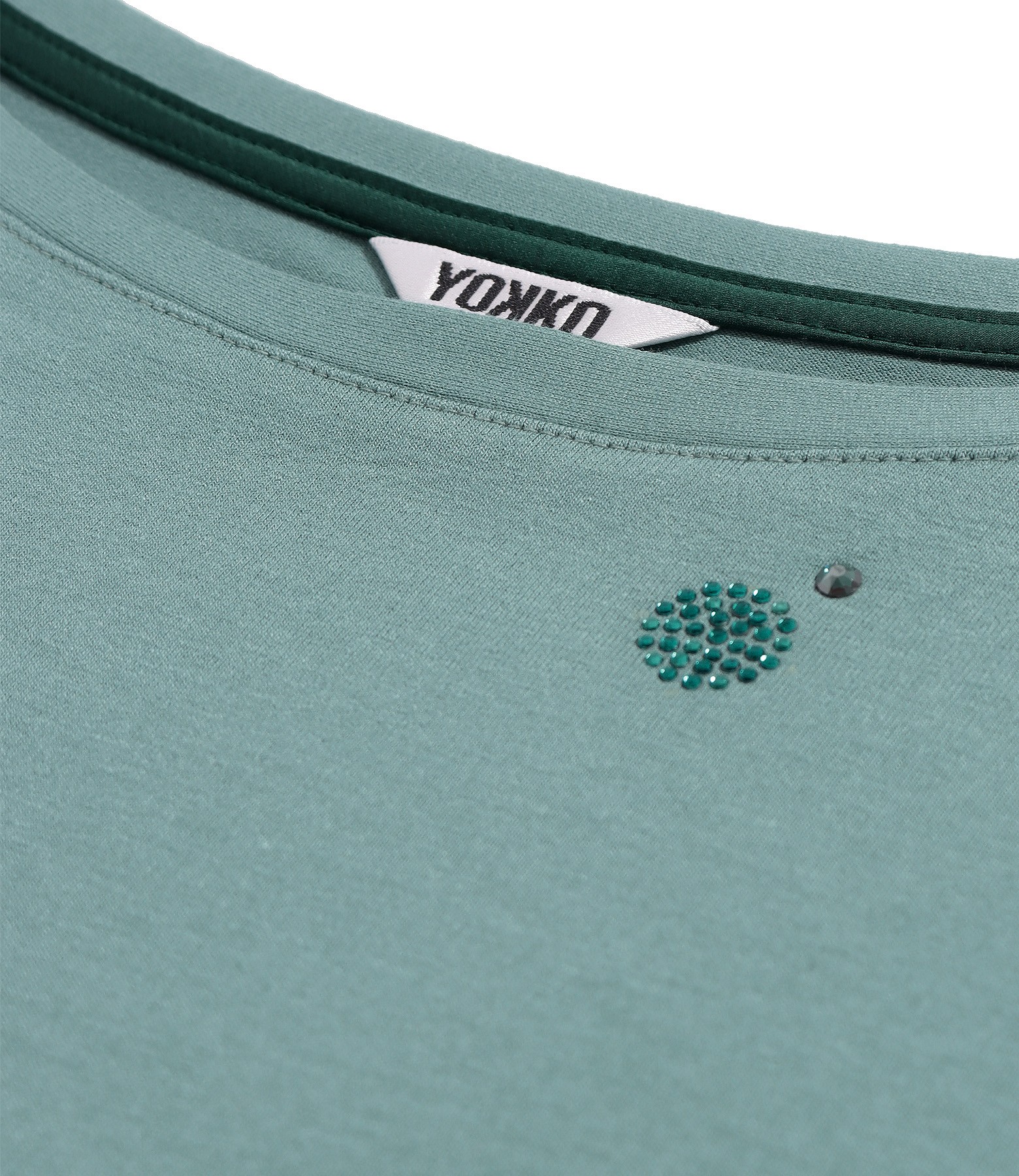 Elastic jersey blouse with short sleeves and round neckline with crystals appliqué.