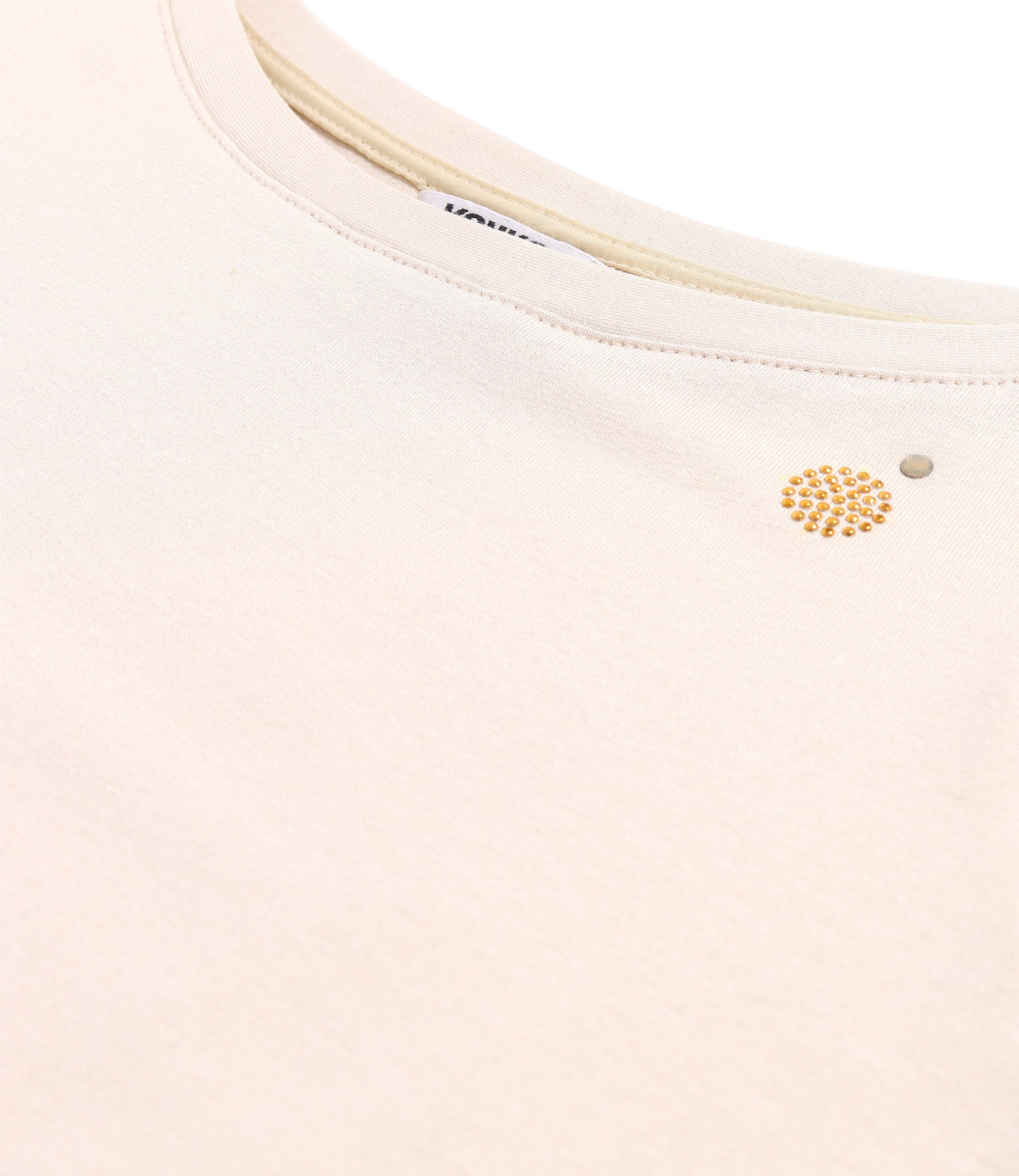 Elastic jersey blouse with short sleeves and round neckline with crystals appliqué.