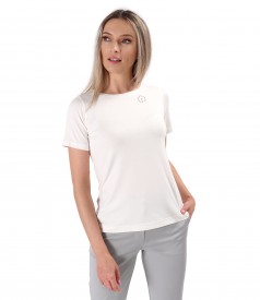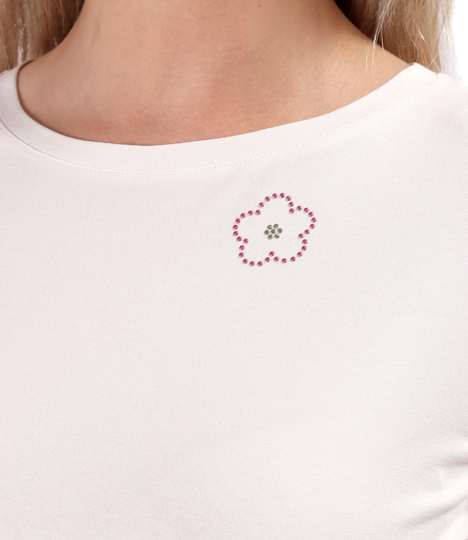 Elastic jersey blouse with short sleeves and round neckline with decorative appliqué in the shape of a flower.