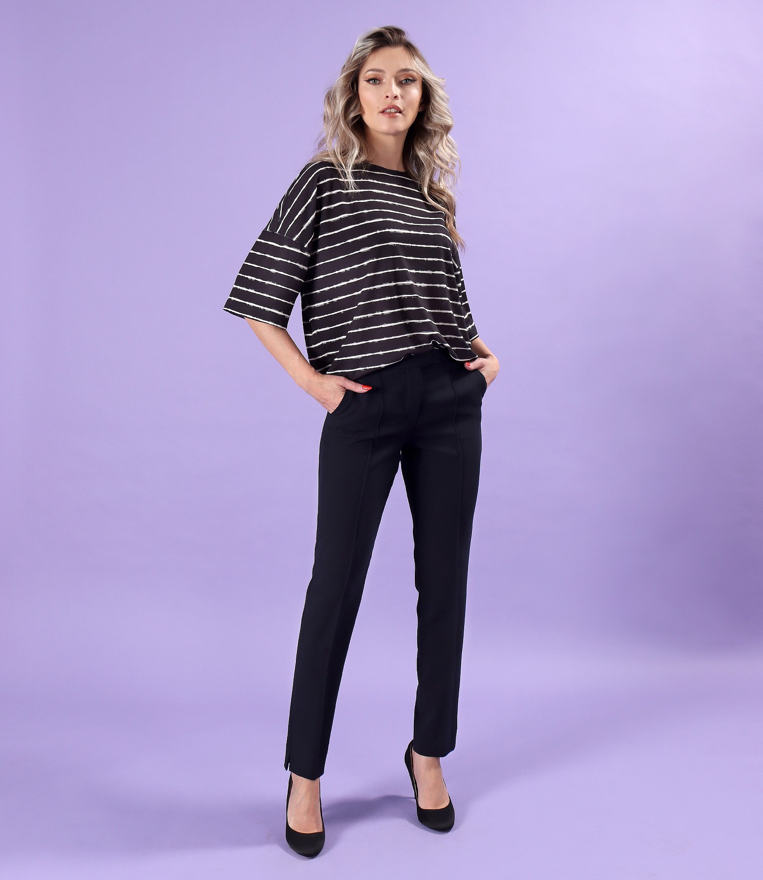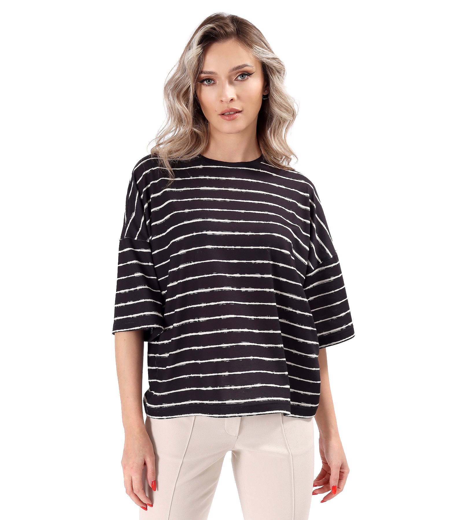 Striped elastic jersey blouse with short dropped sleeves and round neckline.