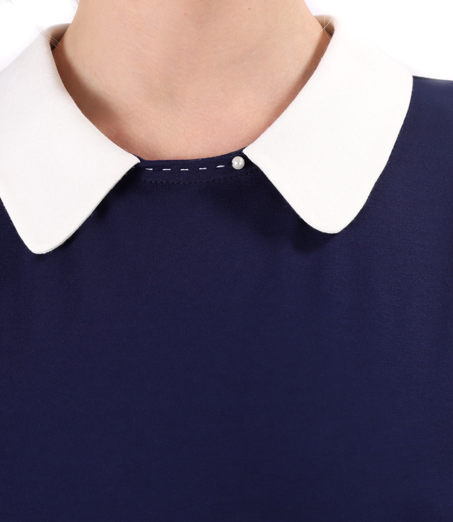 Elegant blouse made of elastic jersey with white collar, short sleeves, decorative seam in contrast at the neckline, and pearl. It closes with a button on the middle back.