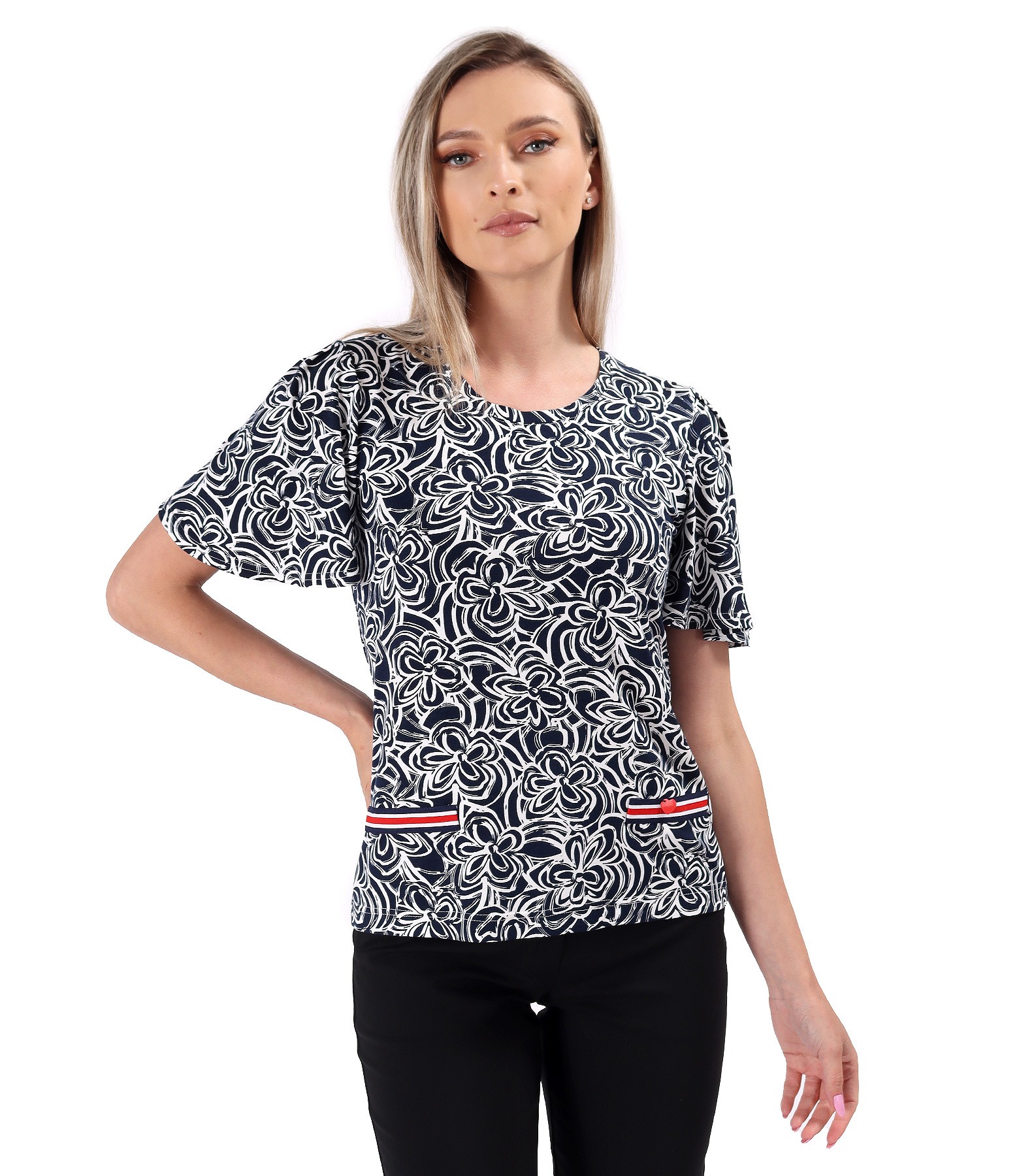 Elastic viscose jersey blouse printed with floral motifs, with a round neckline, short sleeves, and a decorative band with a metallic heart at the waist.
