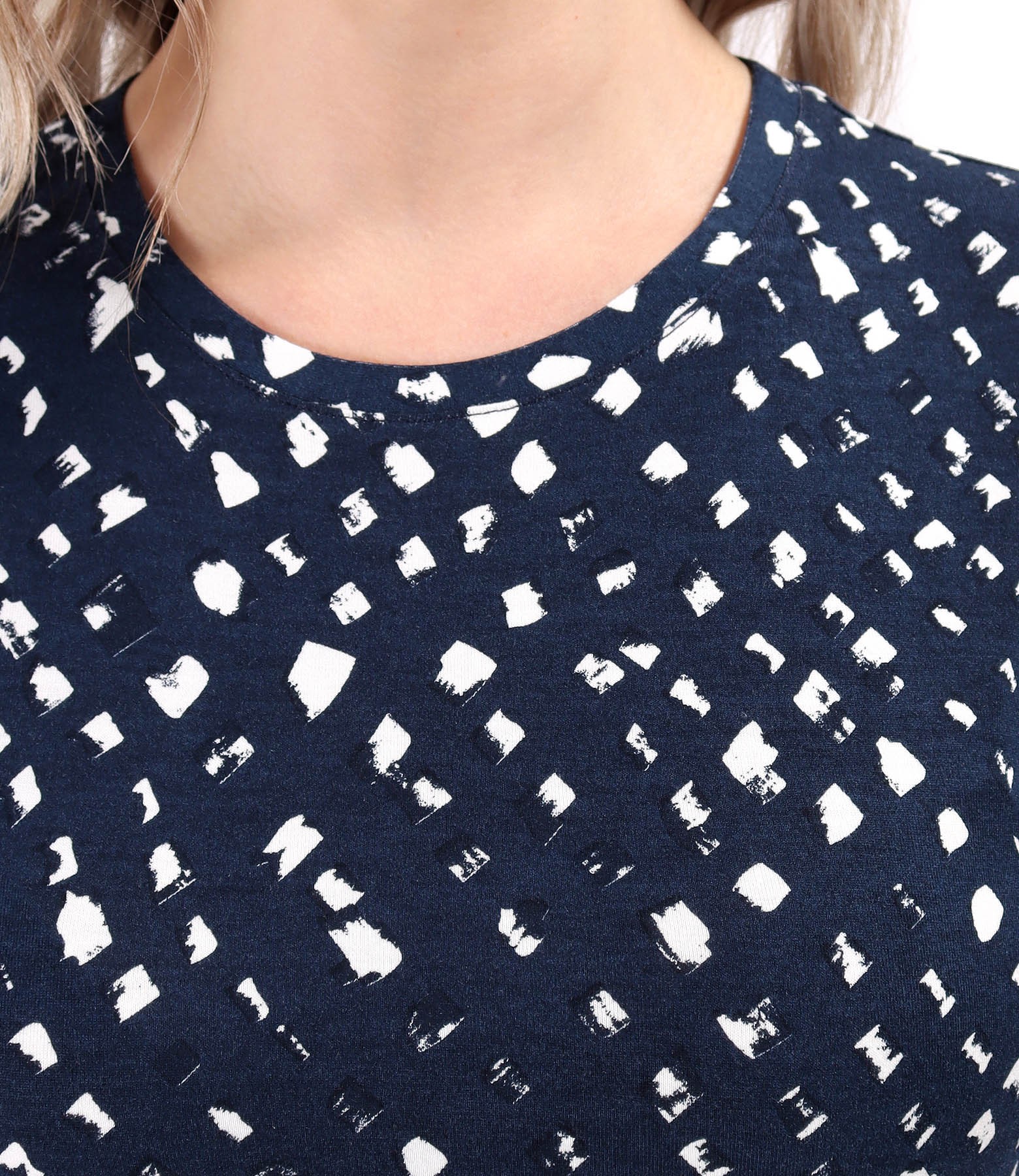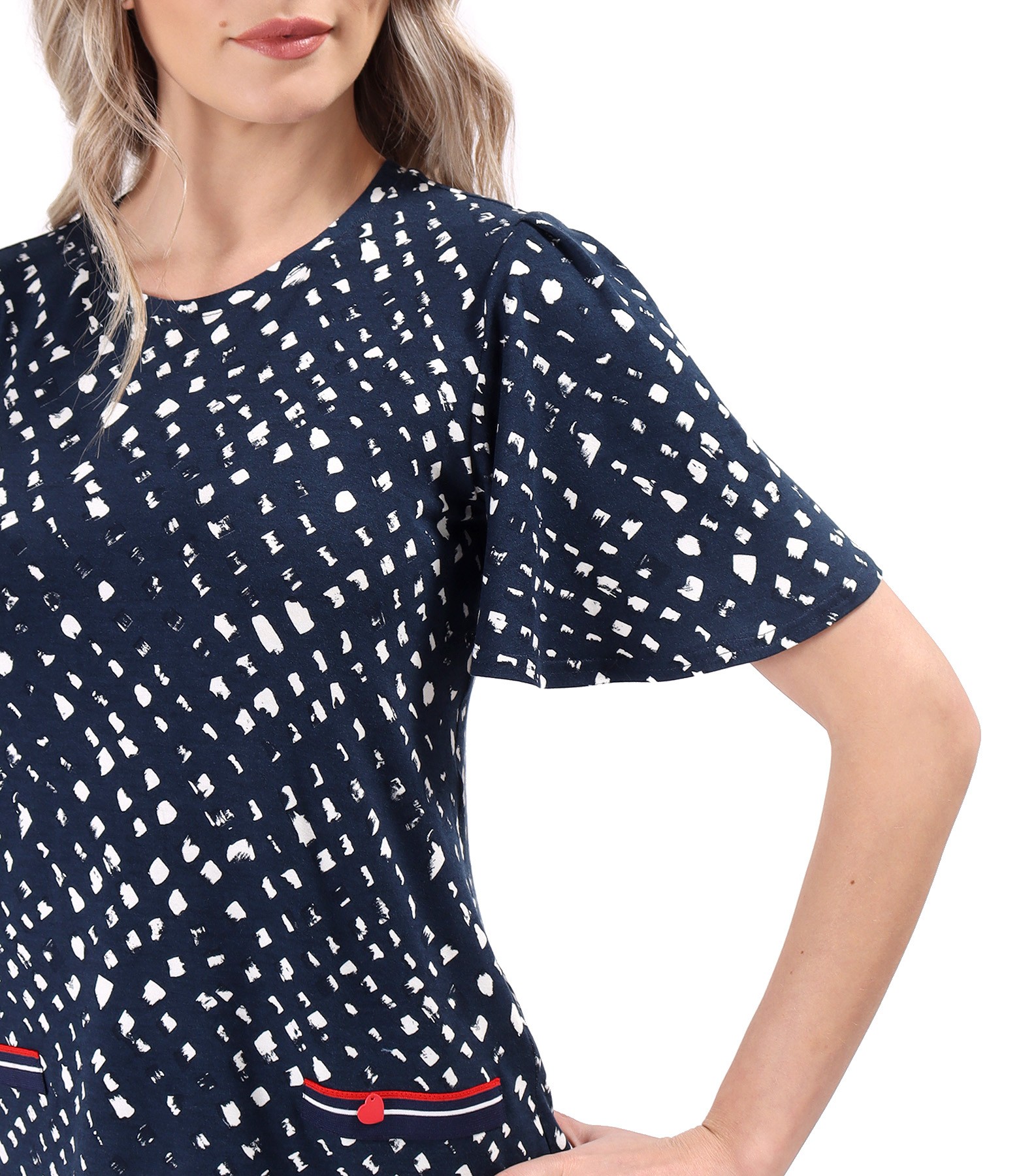 Elastic viscose jersey blouse printed with geometric motifs, with a round neckline, short sleeves, and a decorative band with a metallic heart at the waist.