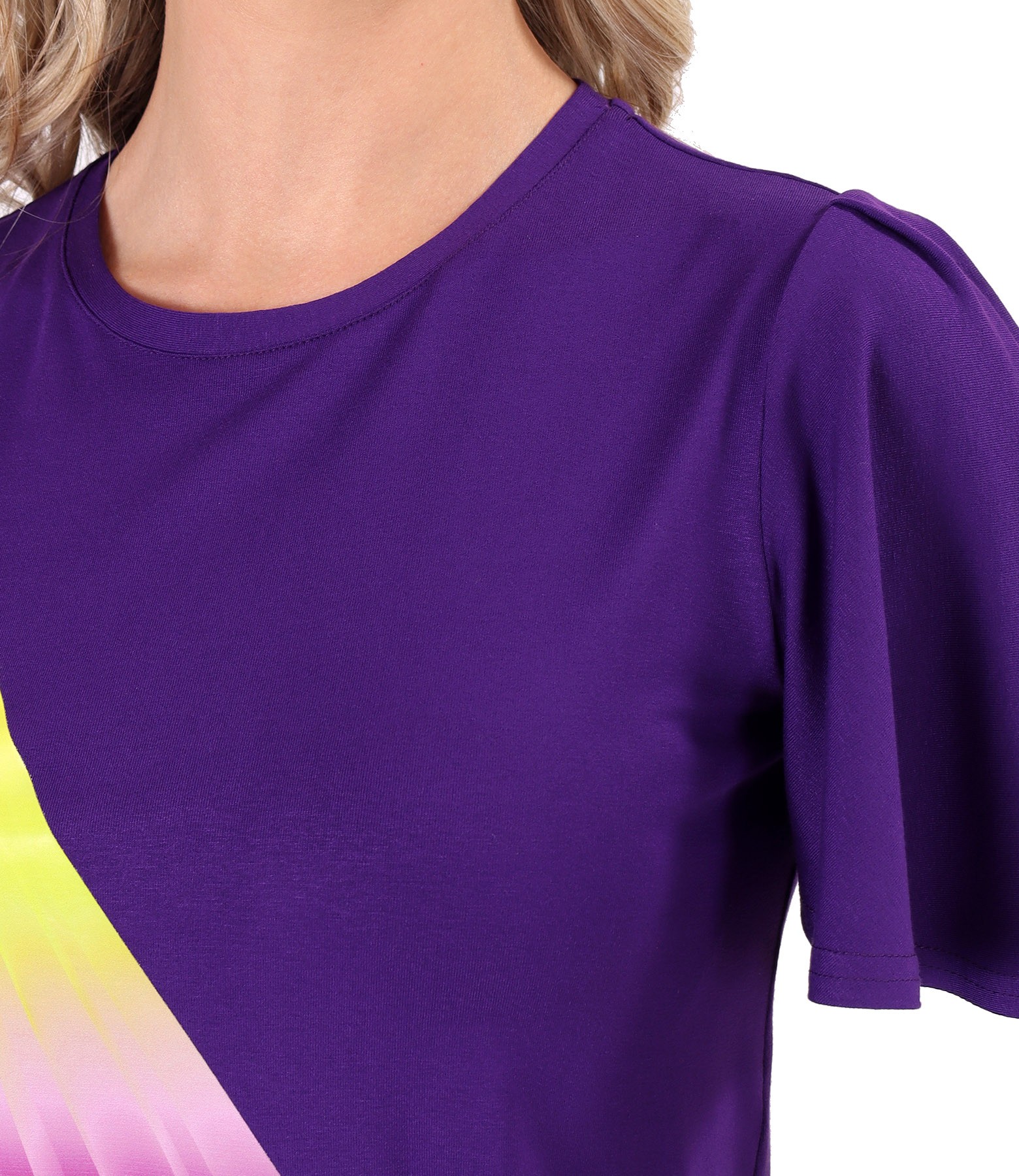 Elastic jersey blouse with wide sleeves, printed on the front by screen printing, and round neckline.