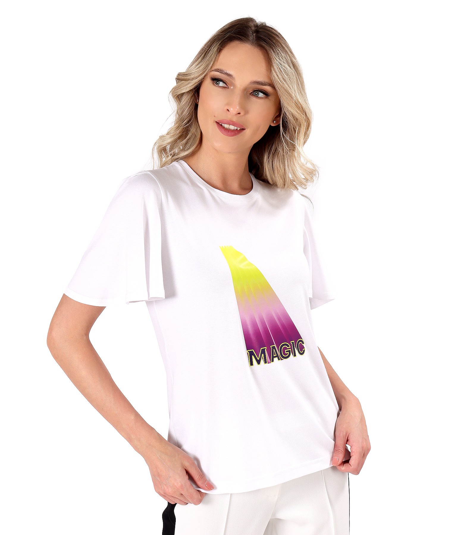 Elastic jersey blouse with wide sleeves, printed on the front by screen printing, and round neckline.