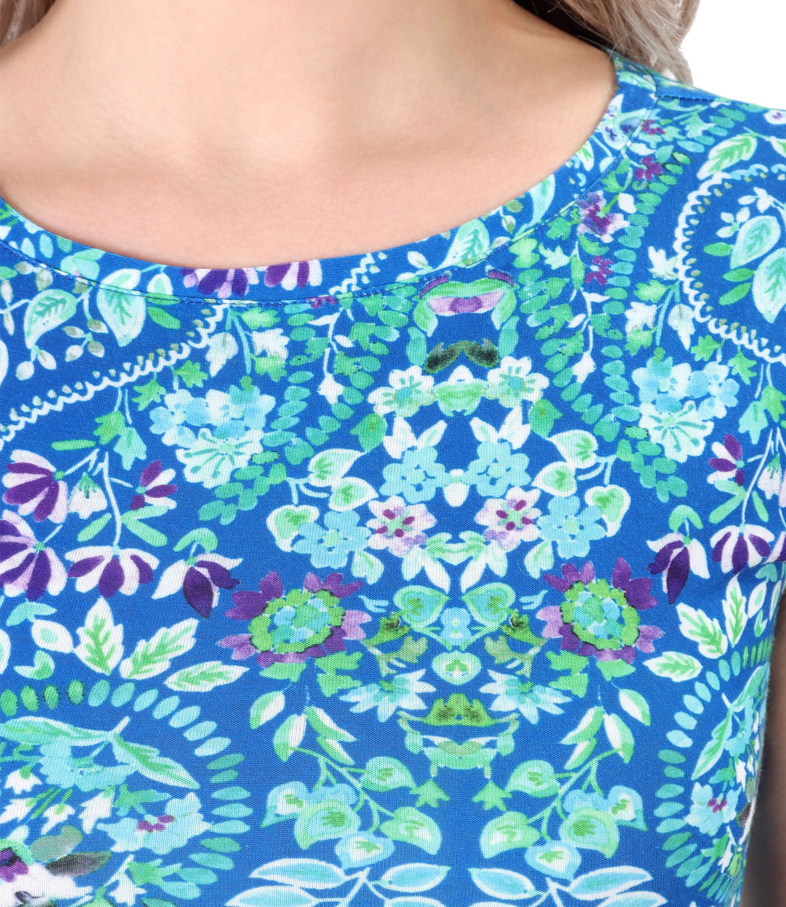 Elastic jersey dress printed with floral motifs, unlined, with a boat neckline and dropped shoulders.