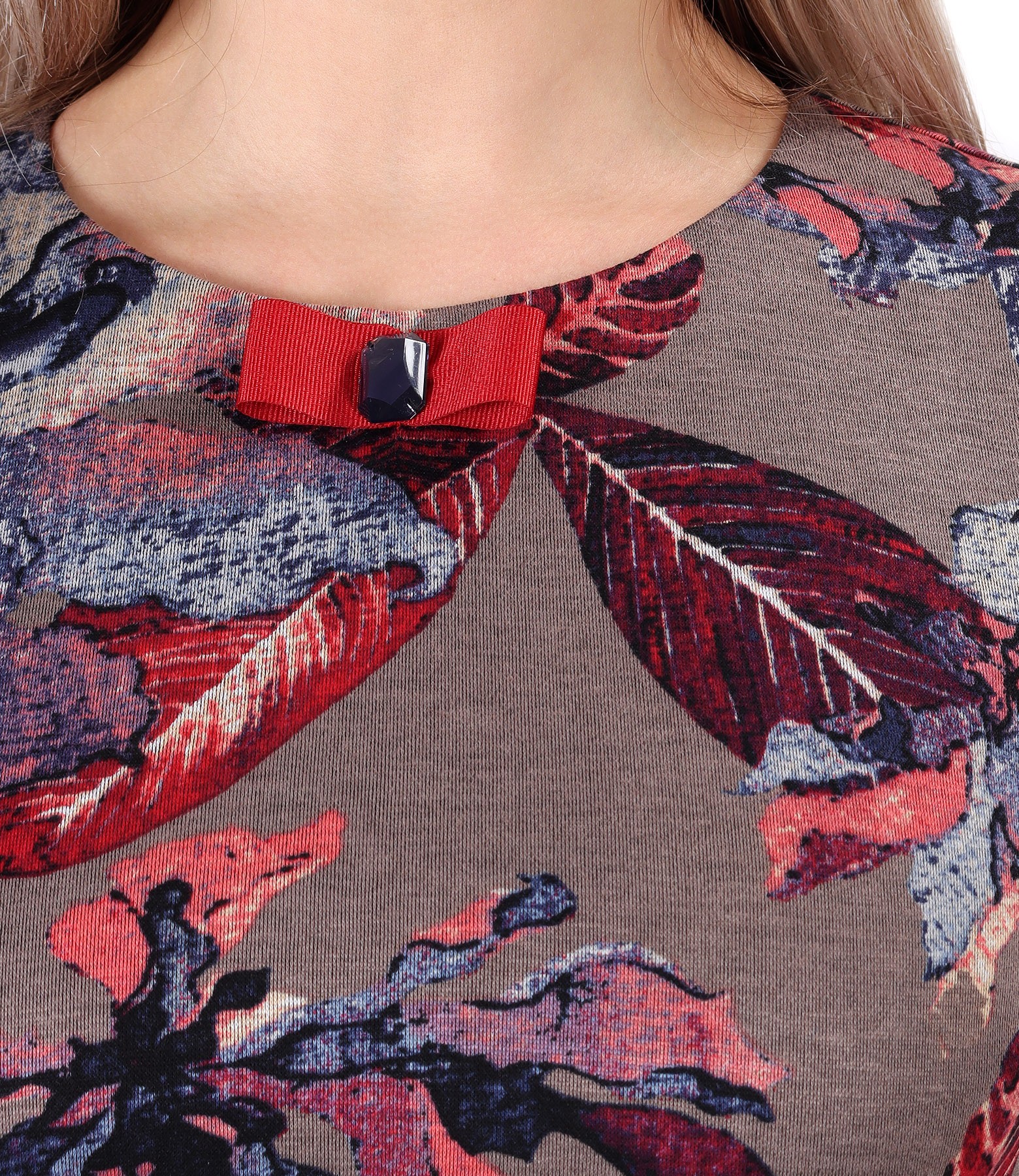 Midi dress, unlined, made of elastic jersey with viscose, printed with floral motifs, with 3/4 sleeves and rips bow on the decolletage. Closes with a zipper hidden in the middle of the back.