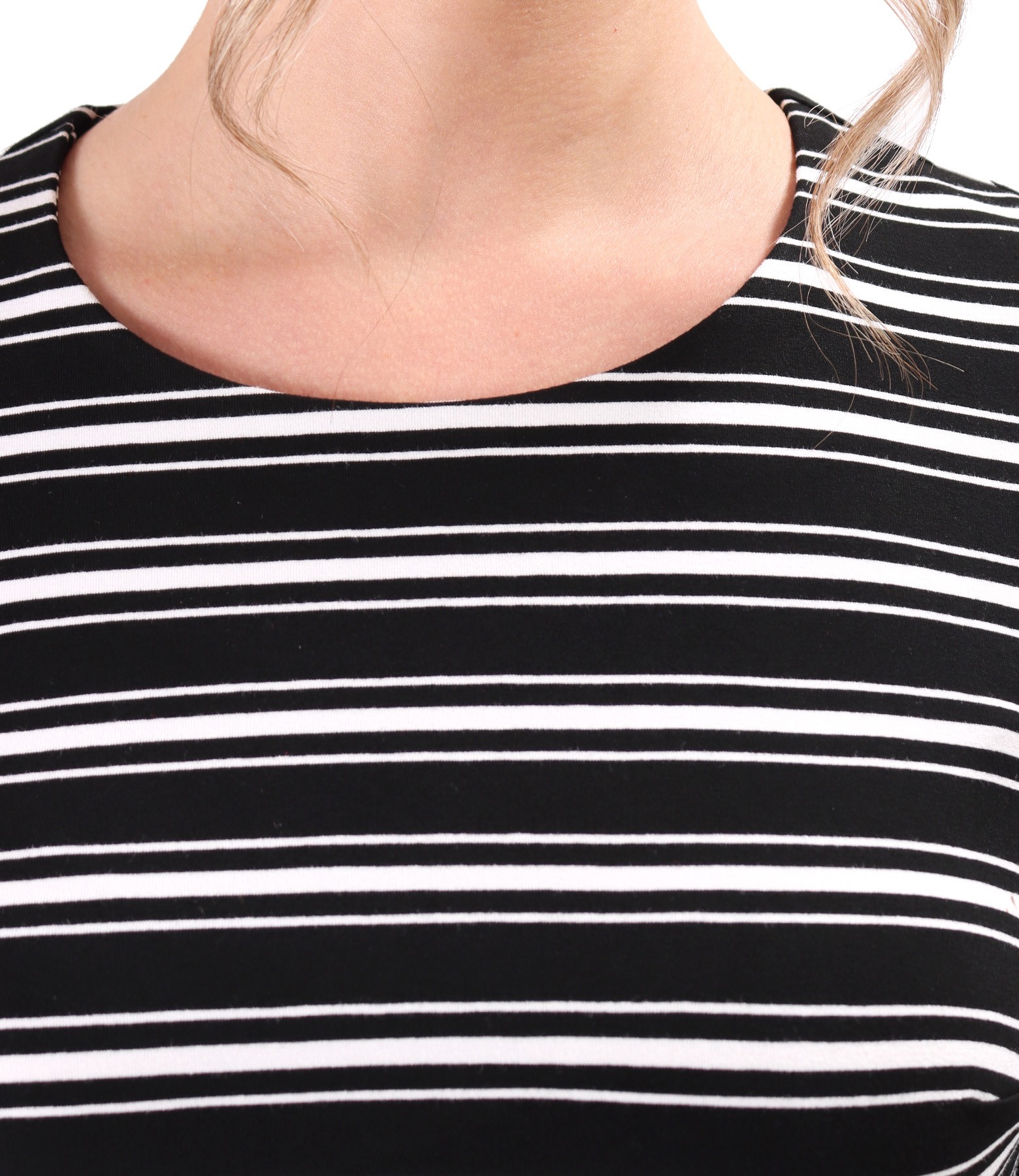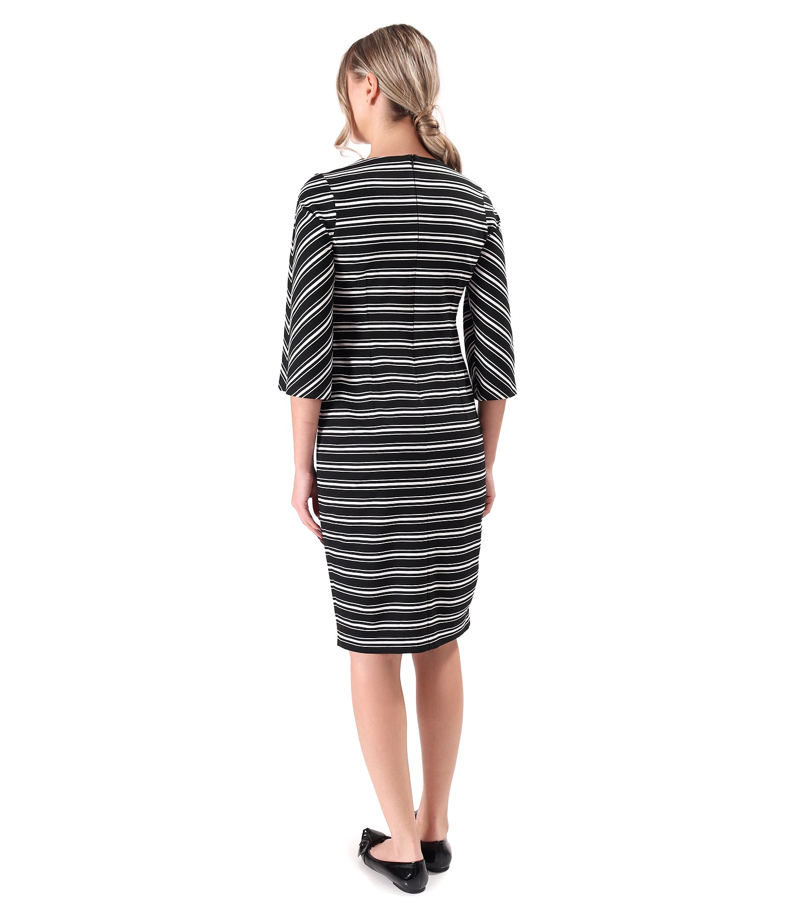 Elastic jersey dress printed with stripes, 3/4 flared sleeves and a round neckline. It closes with a hidden zipper at the center back.