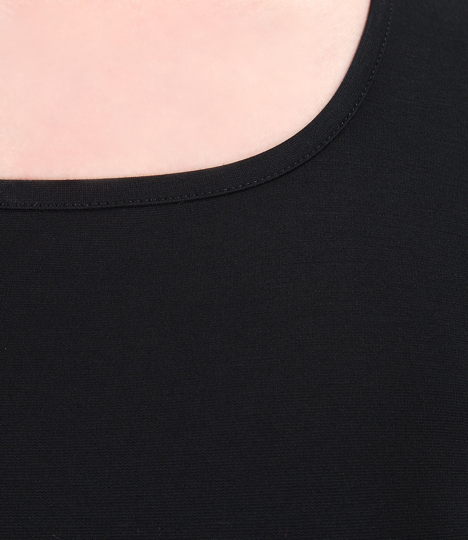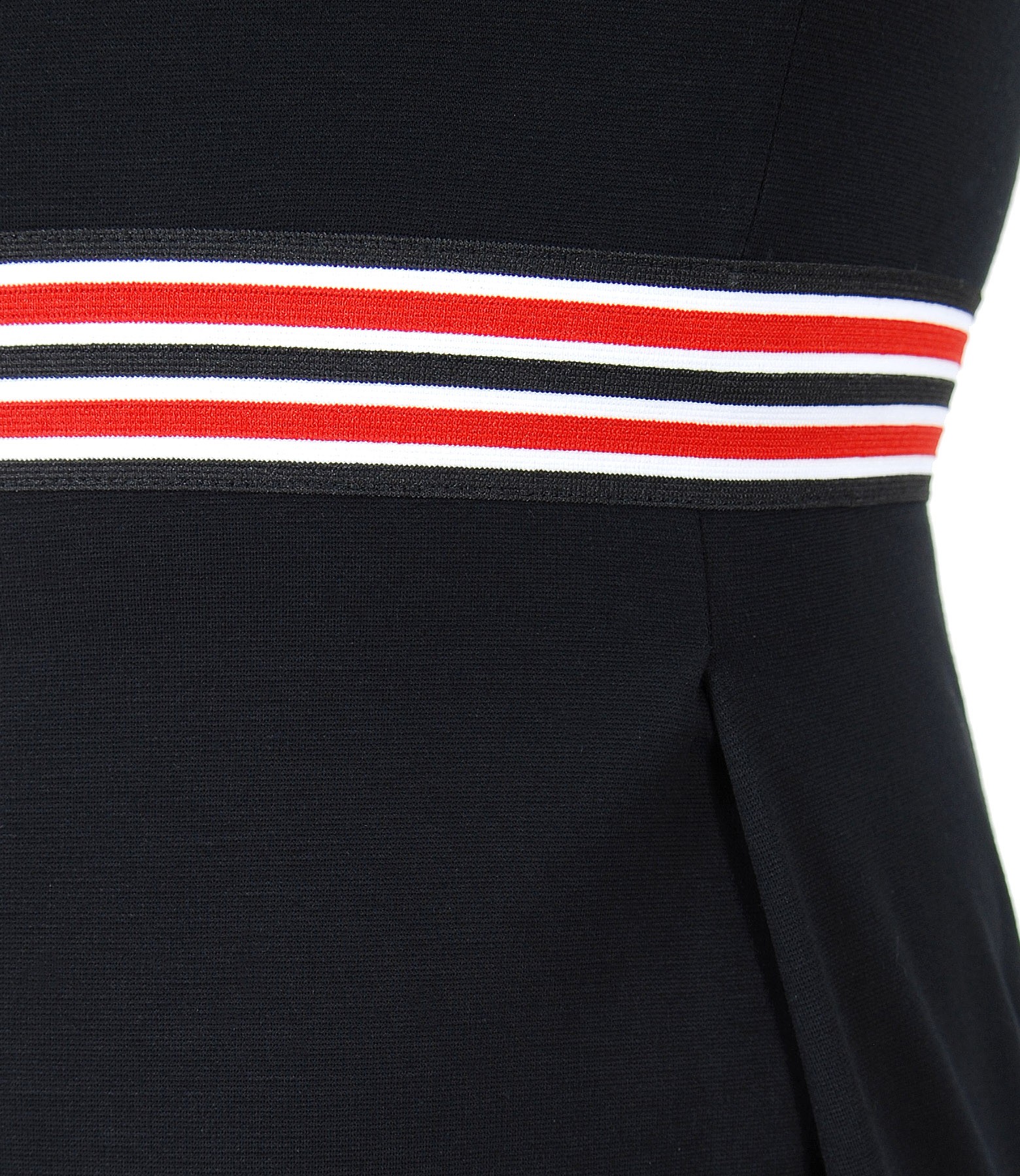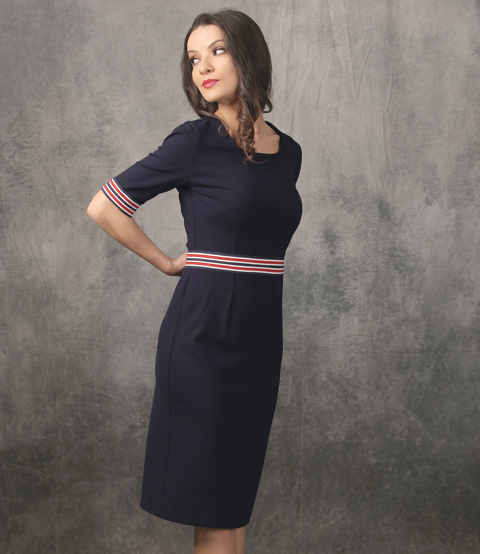 Elastic jersey dress, inlay, with round low-cut neck and elastic trim applied on waist and sleeves. Closes with hidden zipper on the middle back.