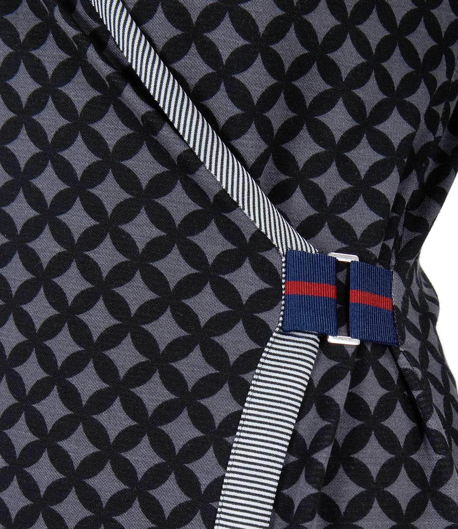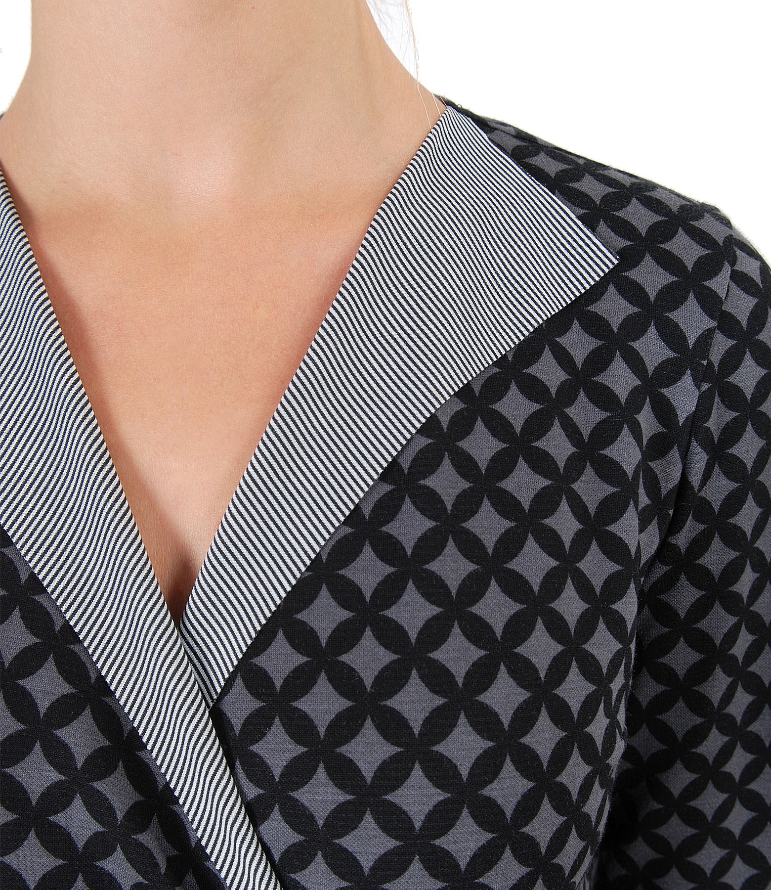 Elastic jersey dress with geometric print, with 3/4 sleeves and rips band on the left side. Have no closing system.