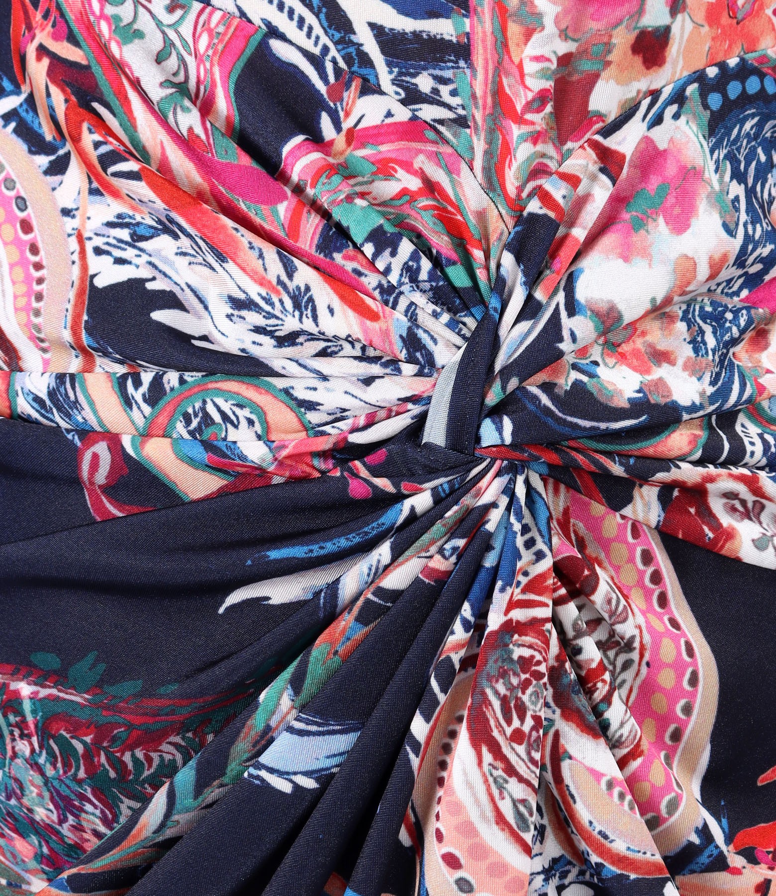 Elastic jersey dress printed with floral motifs, short sleeves, knot on the front and round neckline with lining.