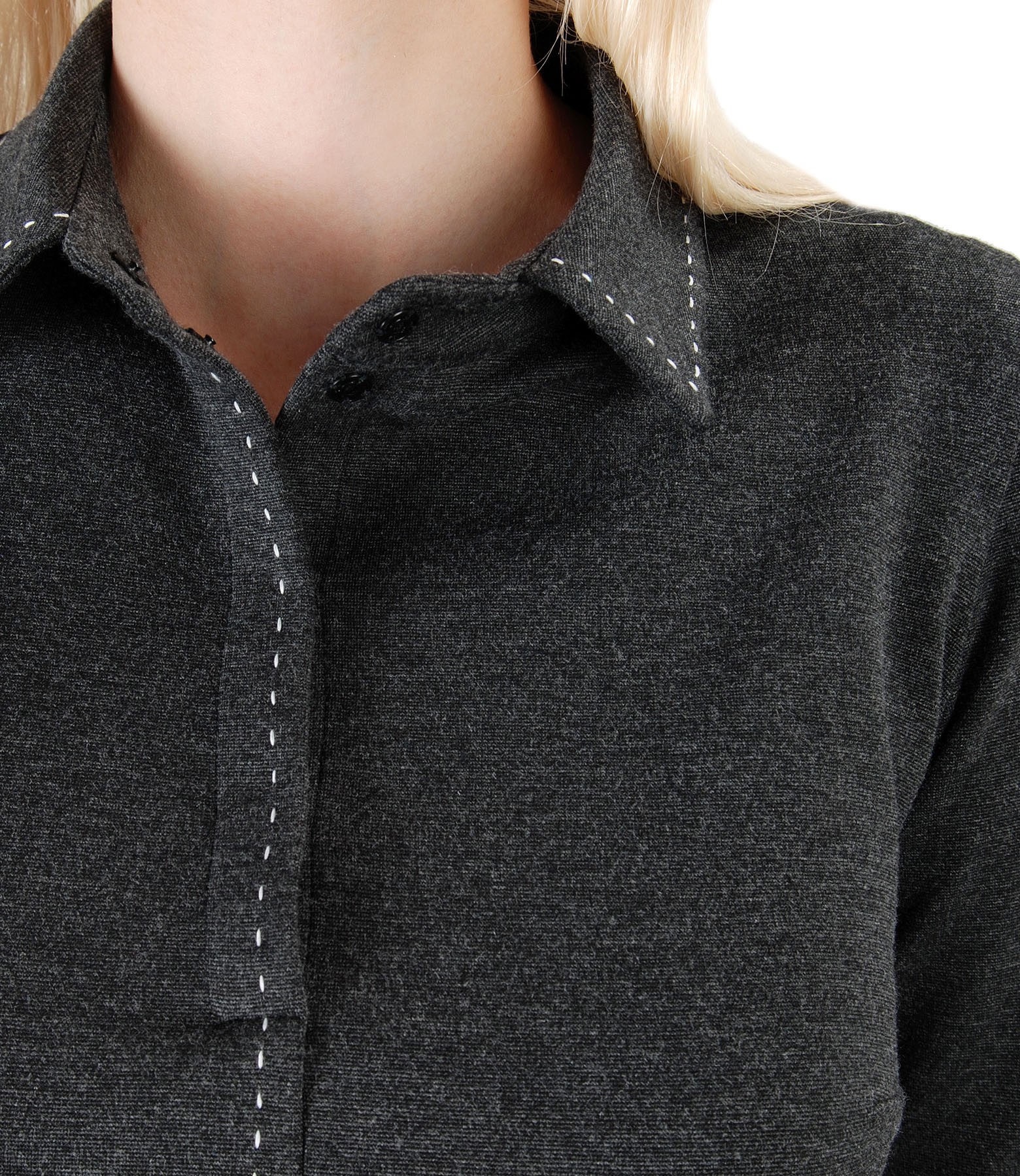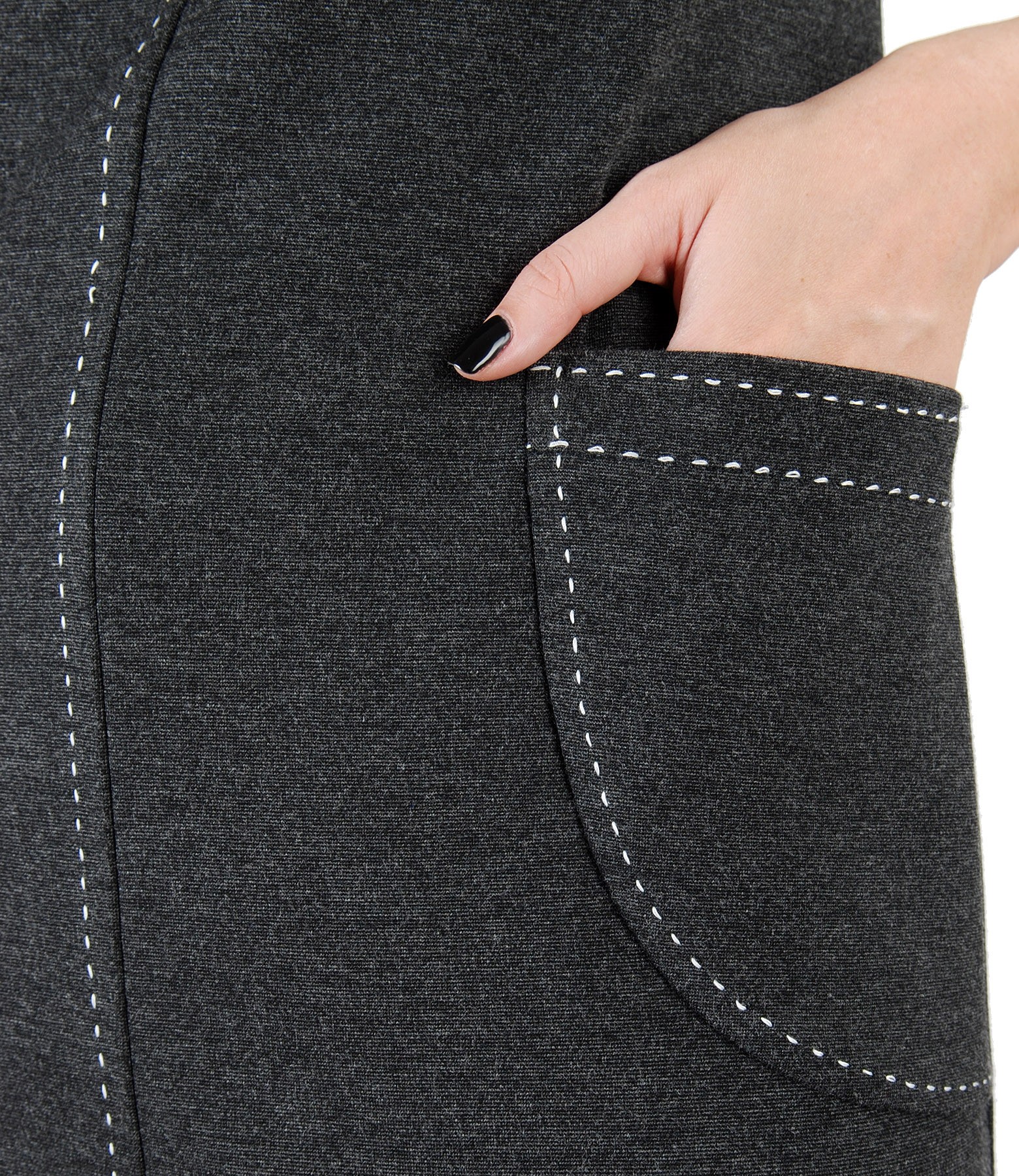 Elastic jersey dress, padded, with 3/4 sleeves, with pockets and seam. Closes with 4 pair of staples.