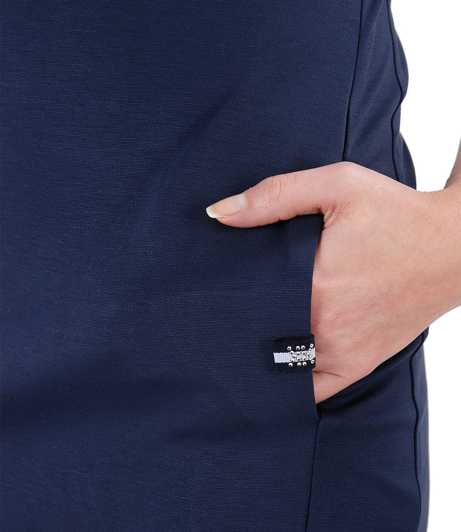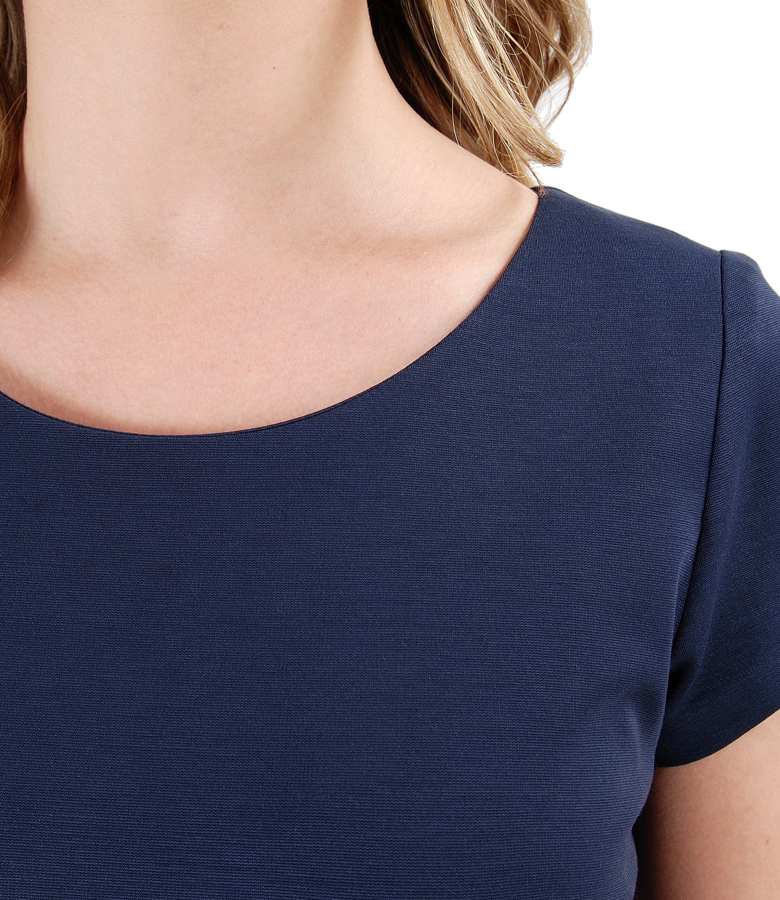 Elastic jersey dress, unlined, with short sleeves, round low-cut neck and side pockets. Closes with hidden zipper on the middle back.