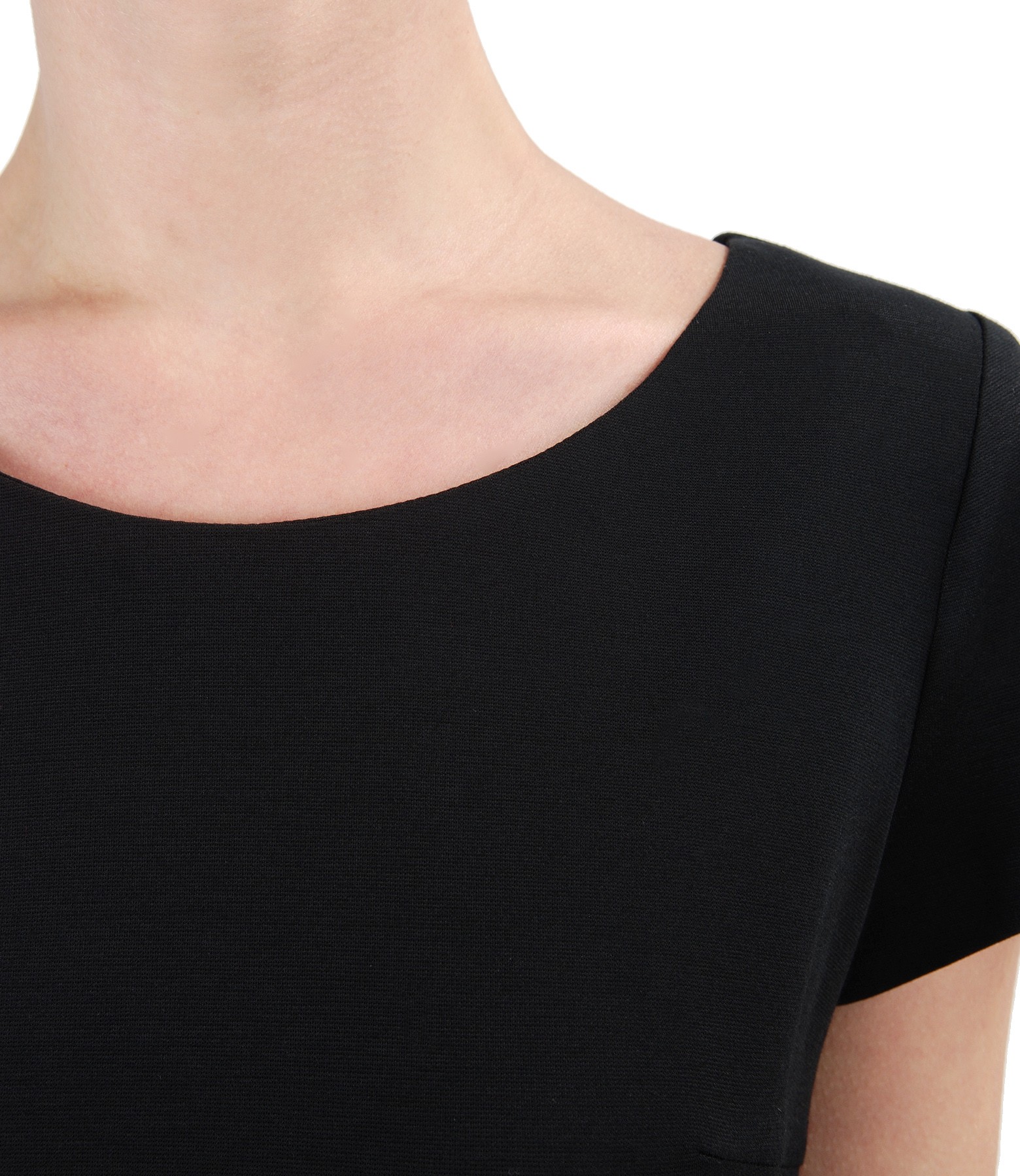 Elastic jersey dress, unlined, with short sleeves, round low-cut neck and side pockets. Closes with hidden zipper on the middle back.