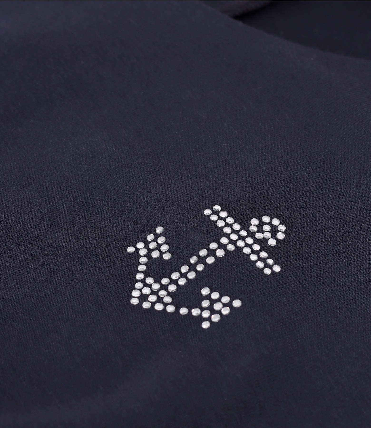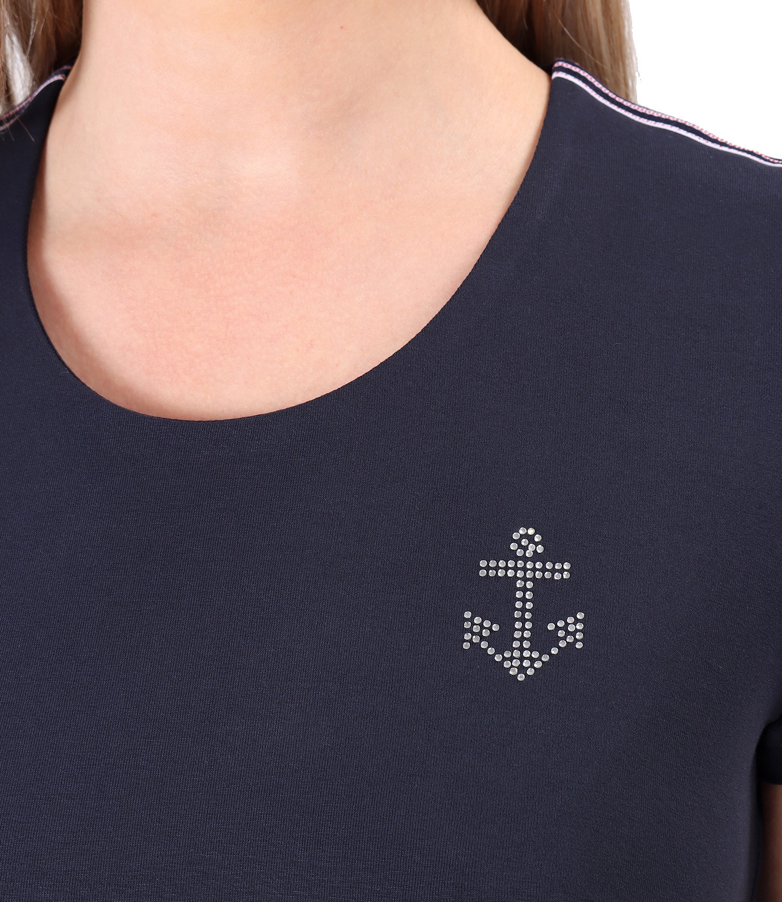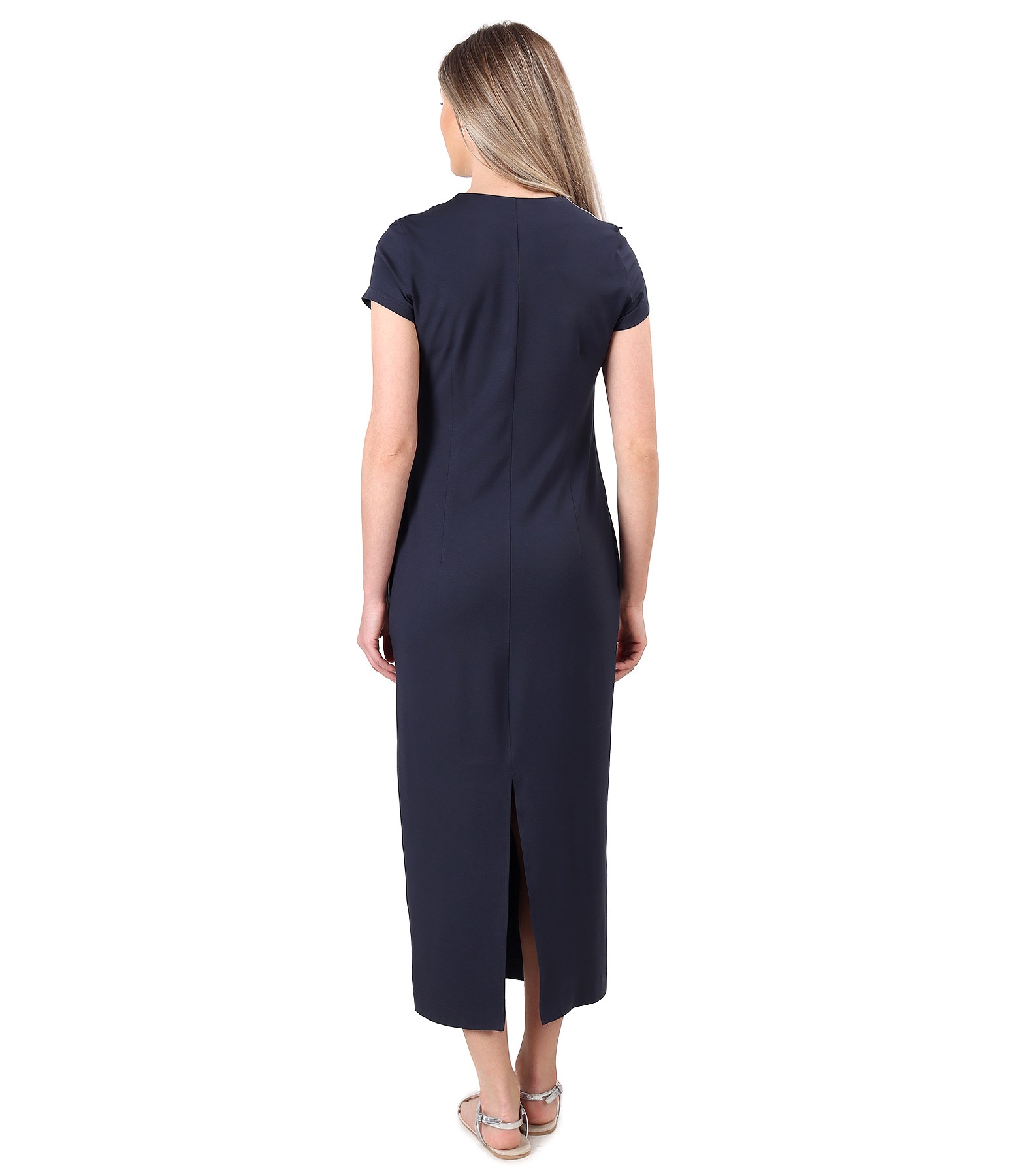 Long dress in viscose elastic jersey, unlined, with round neckline, side pockets, with rips band on the shoulders and with the application of crystals in the shape of an anchor on the chest. It has a slit at the back and no closing system.