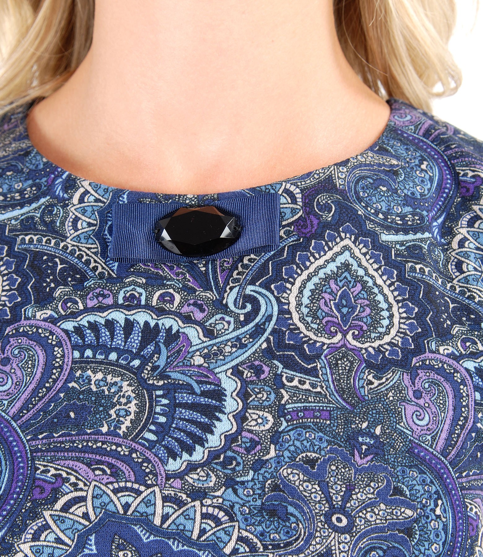 Midi dress, unlined, made of elastic jersey with viscose, with floral print and rips bow on decolletage. Closes with hidden zipper on the middle back.