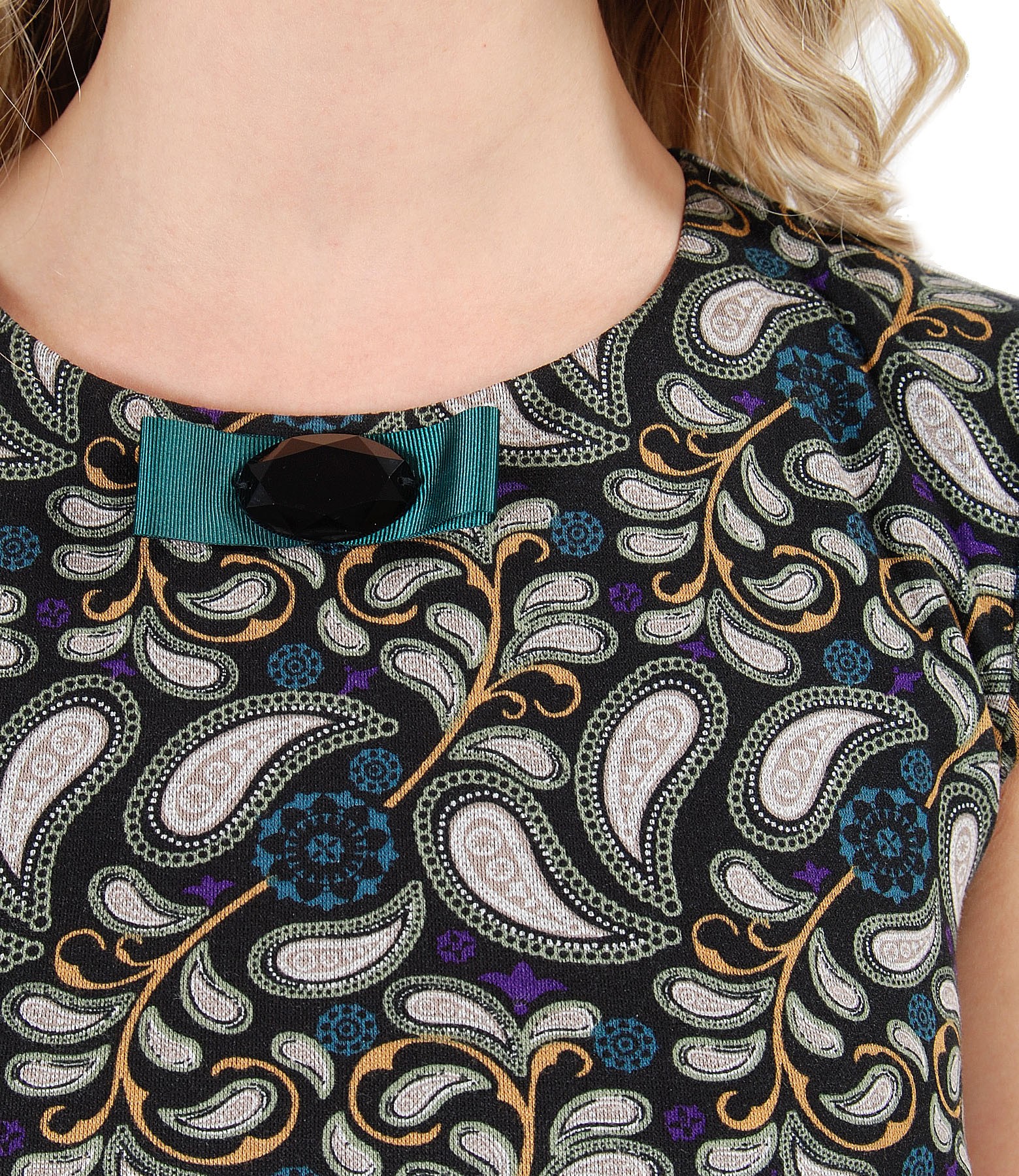 Midi dress, lined, made of elastic jersey with viscose, with floral print and rips bow on decolletage. Closes with hidden zipper on the middle back.