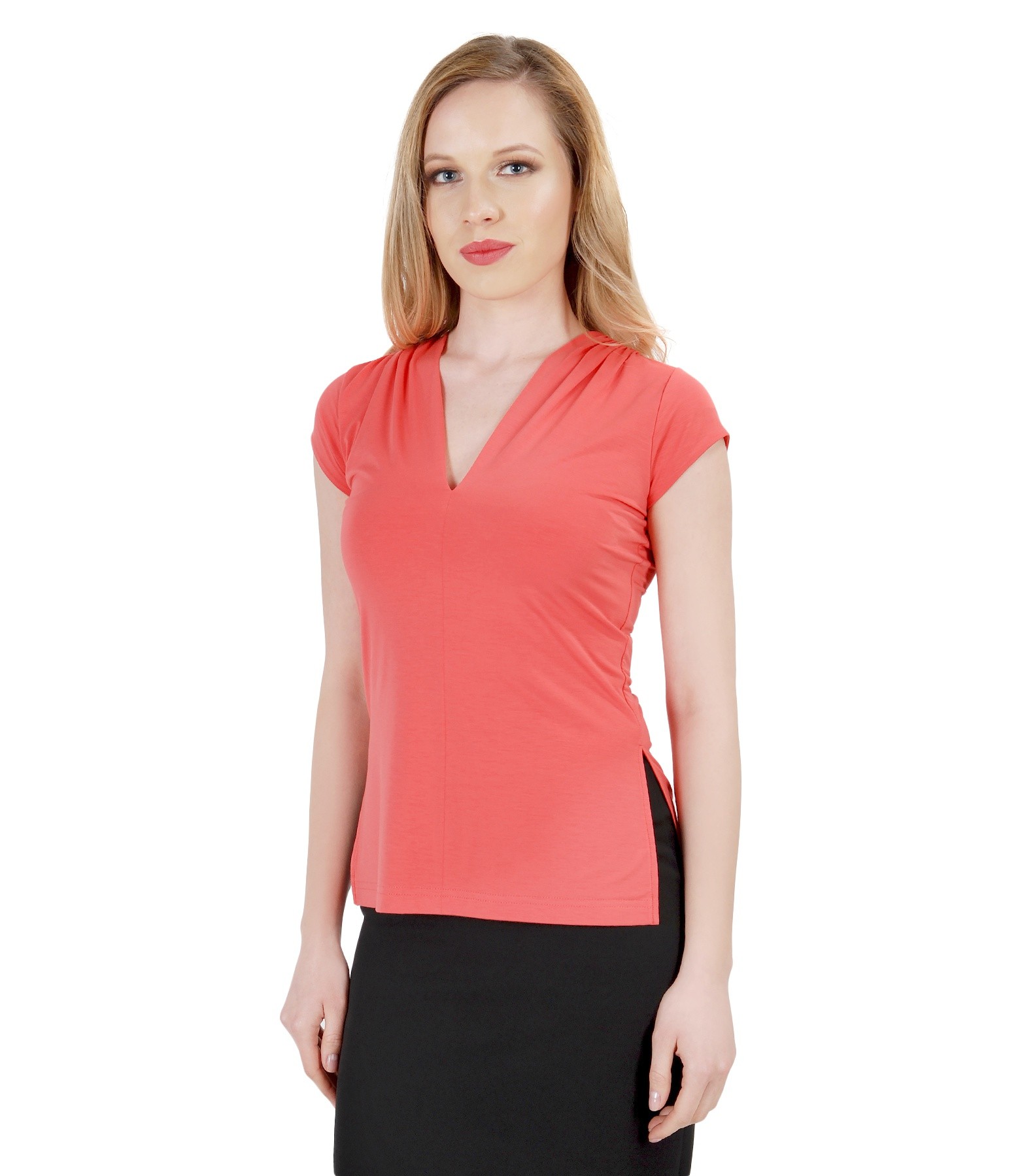 Soft elastic jersey t-shirt, with V low-cut neck, ruffled shoulders, short sleeves and side slits.