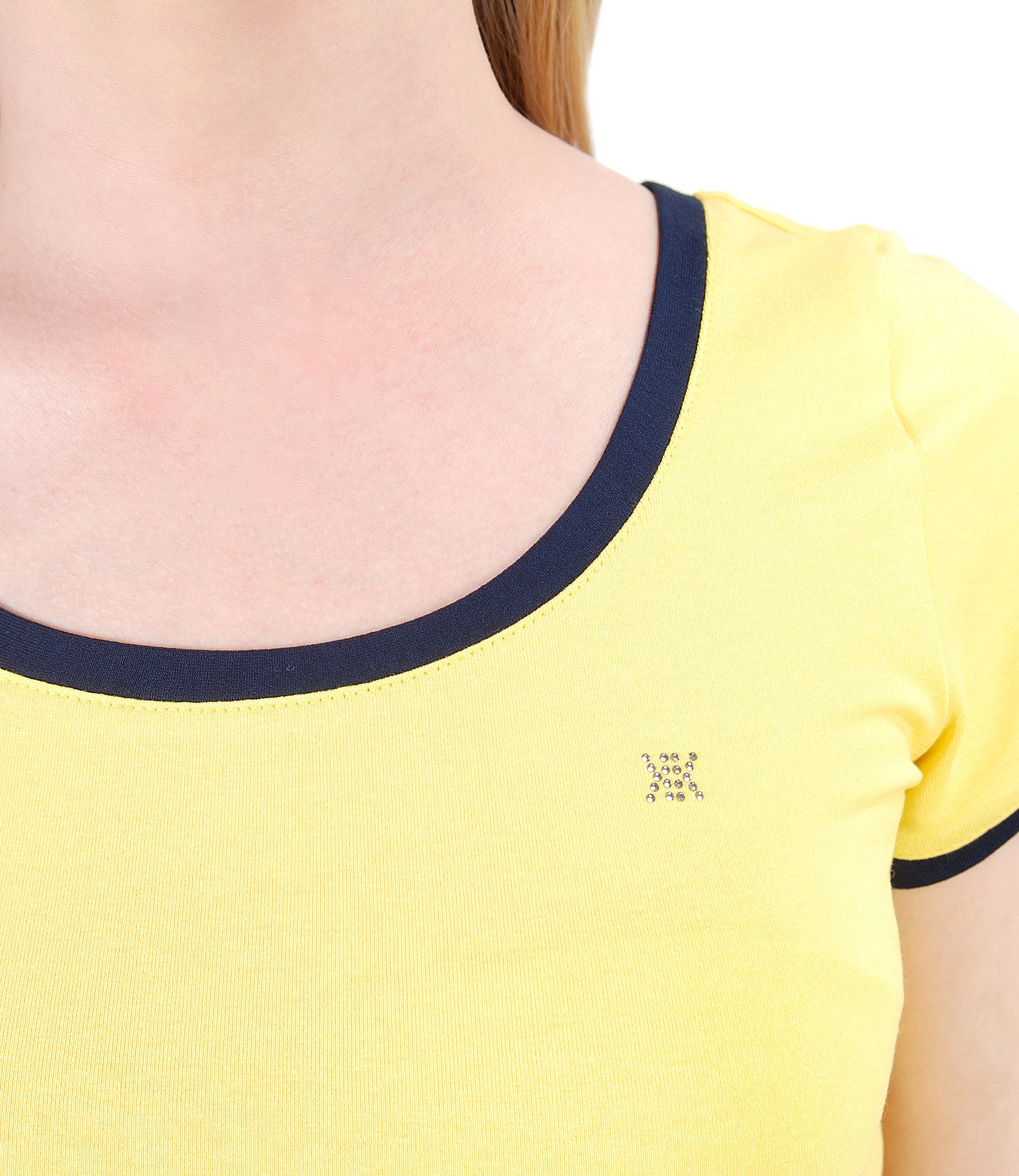 Elastic jersey t-shirt with round neckline and short sleeves, finished with trim at termination, sleeves and neckline.